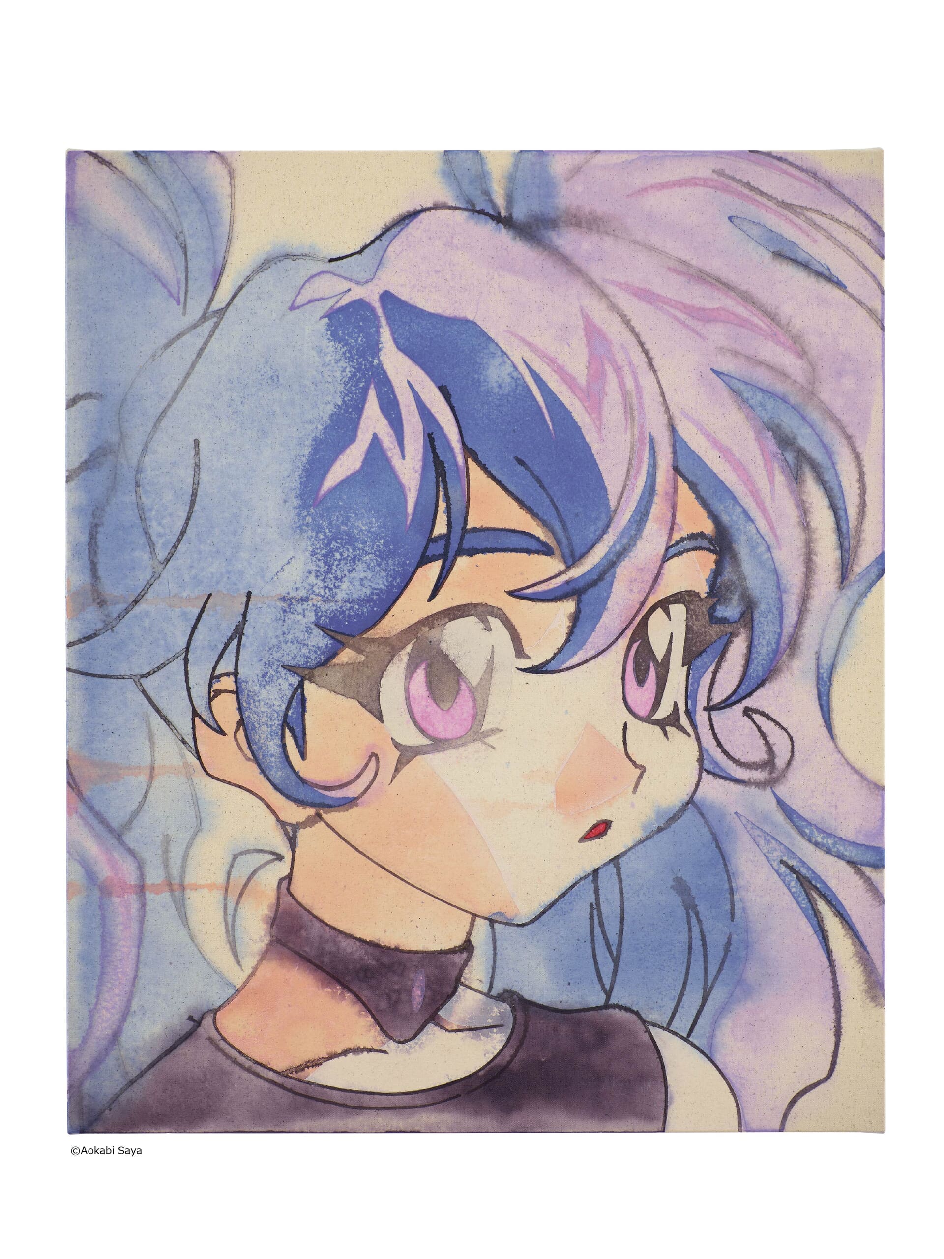 藍嘉比沙耶は1997年生まれ。自身の生まれた前後に日本で制作されたアニメーションに登場するキャラクターを参考にした平面作品を制作している。
