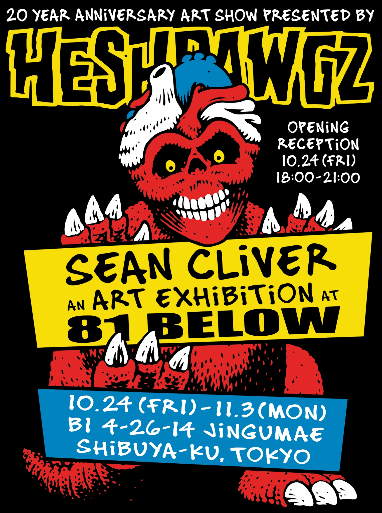 スケートグラフィックシーンを代表するアメリカのアーティスト、Sean Cliver(ショーン・クライヴァー)の個展が東京、大阪で開催される。東京の会場は81 BELOW。今年の7月にオープンしたGUESS JEANS Tokyoの地下に位置する新たなギャラリーであり、主催するのは原宿の名スケートショップ、HESHDAWGZ、会期は10月24日(金)から11月3日(月・祝)まで。大阪の会場は、大阪は谷町のピザショップ、Henry’s PIZZAの3階に位置するRISE ABOVE GALLERY。主催するのは、この場所を運営するグラフィックアーティストのVERDYであり、会期は11月1日(土)から11月9日(日)までとなる。