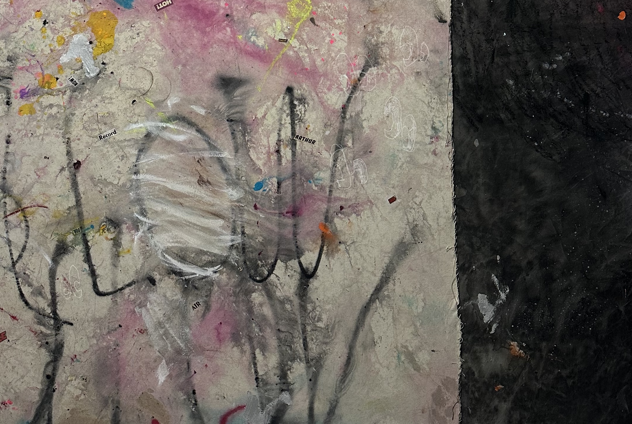 Acrylic, oil stick, house paint, oil pastel, marker, aerosol on