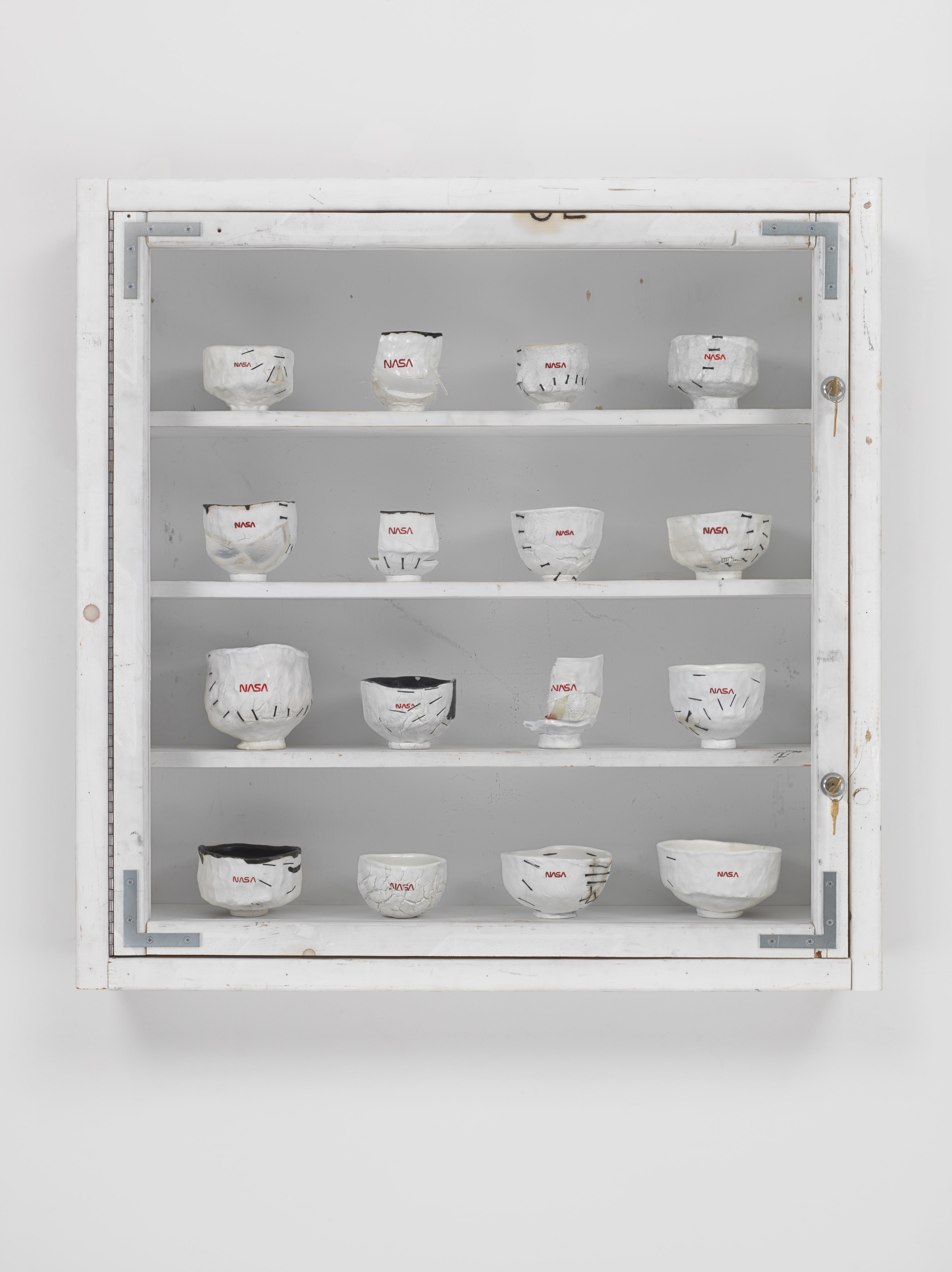 トム・サックス, Stitches, 94.0×21.0×94.0 cm, plywood, ConEd barrier, English porcelain, Temple white glaze, NASA Red engobe inlay, epoxy resin, carbon fiber, gold luster, steel hardware, 2023 ©︎Tom Sachs, Courtesy of Tomio Koyama Gallery and Tom Sachs Studio