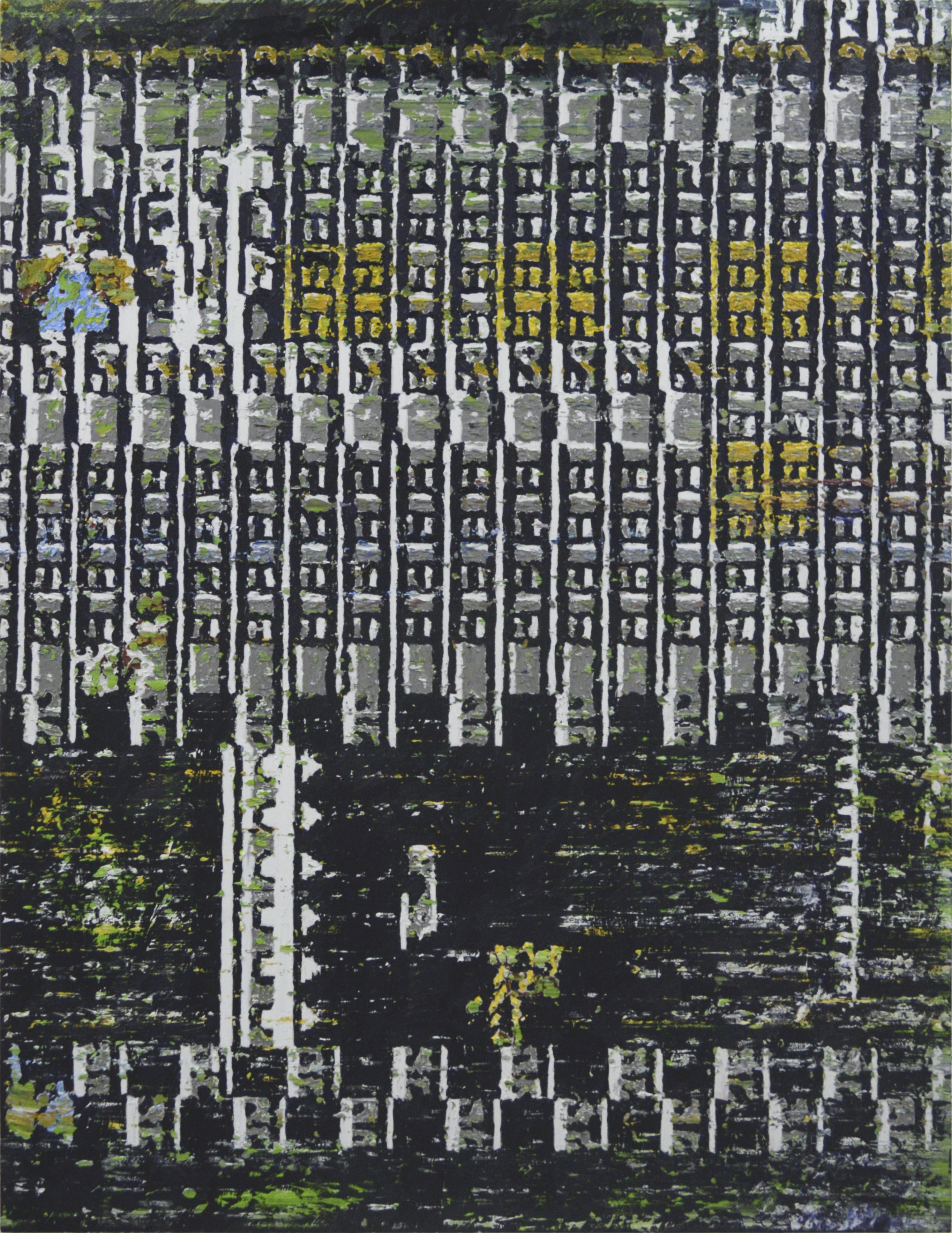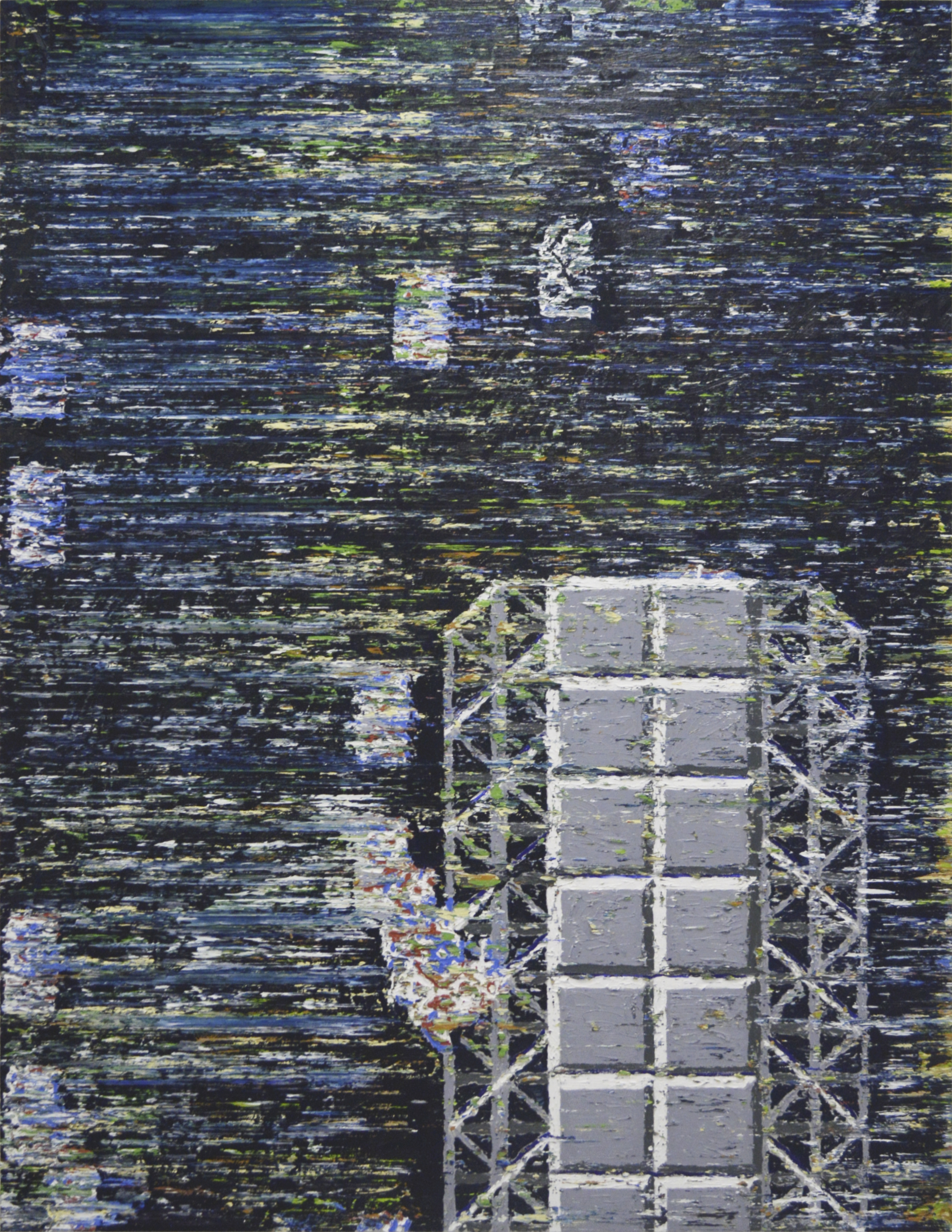 さらに、彼の絵画は、進行が一時停止されたときに残るものを描く。作品は停止した状態の中に存在し、前進は消えることなく断裂する。時間はもはや前へと流れず、空間は不安定となり、視覚的なノイズが浮かび上がる。