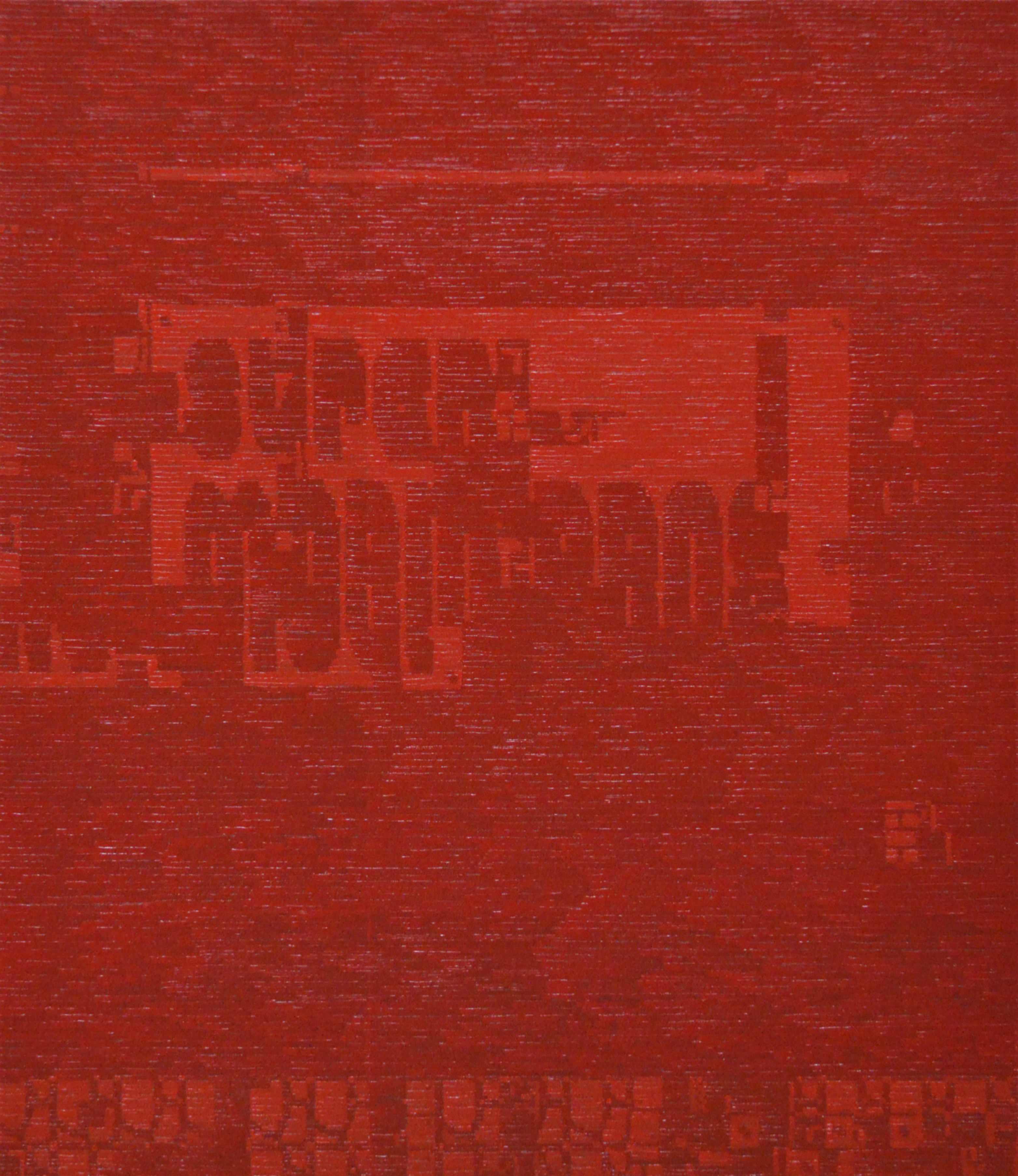 岡田の作品に見られる抽象性は、スタイルとしての選択ではなく、緊張状態にあるシステムが表出したものだという。ファミコン初期のゲームやピクセル化された環境の構造に着想を得ながら、デジタルイメージを引用するのではなく、その仕組みそのものを絵画として展開。ピクセルは単なるイメージの単位ではなく、記憶の単位であり、反復・レイテンシー・エラー・蓄積を内包している。