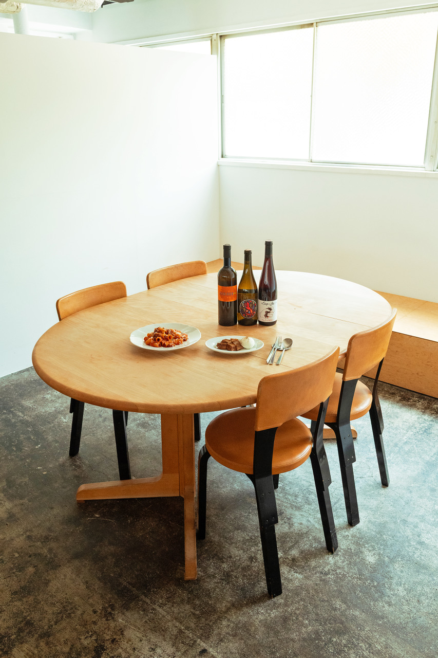 土佐堀川のほとりに佇むビルの2階、イタリアの郷土料理を提供するワインバー。同ビル1階にはナチュラルワインを販売する系列のショップ、il Soffioneが入居する。「調子がいい日は1人でボトルを空けちゃいます」と笑う、ワイン好きな植杉さんの行きつけだ。店主でありソムリエの三吉隼人さんがローマで食べたアマトリチャーナやシチリア伝統のアグロドルチェなど、ワインと相性のいいアラカルトの数々に、思わず「もう一杯」と頬がゆるむ。+3,300円で、1階のボトルワインを料理と一緒に味わえるのも嬉しい。内装は滋賀のNOTA & designに依頼し、信楽焼のカウンターや吉野杉を用いた木工作品をテーブルとして使うなど、まるでギャラリーのような洗練された空間にも注目したい。
