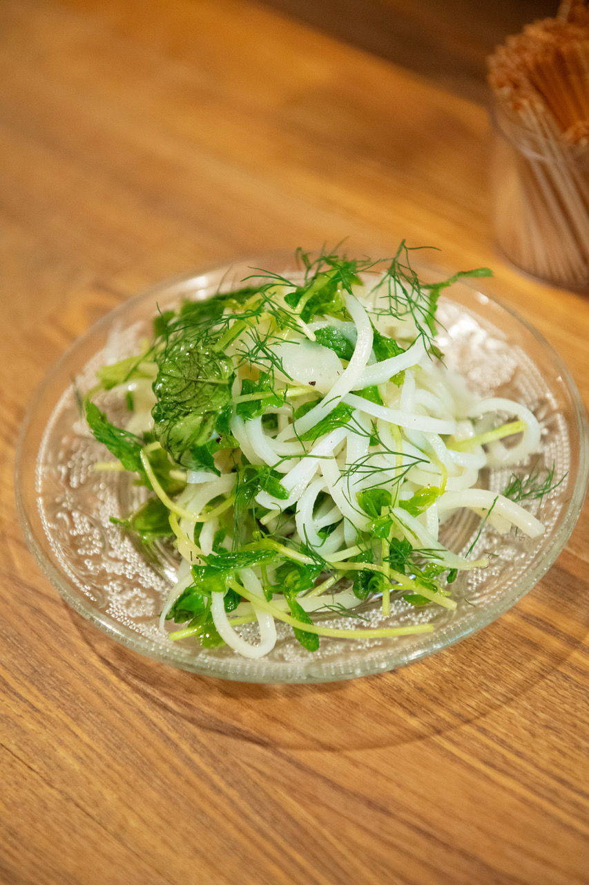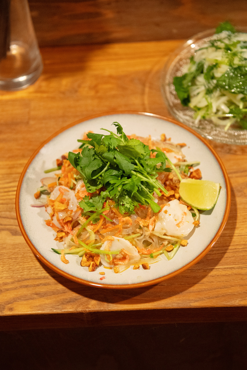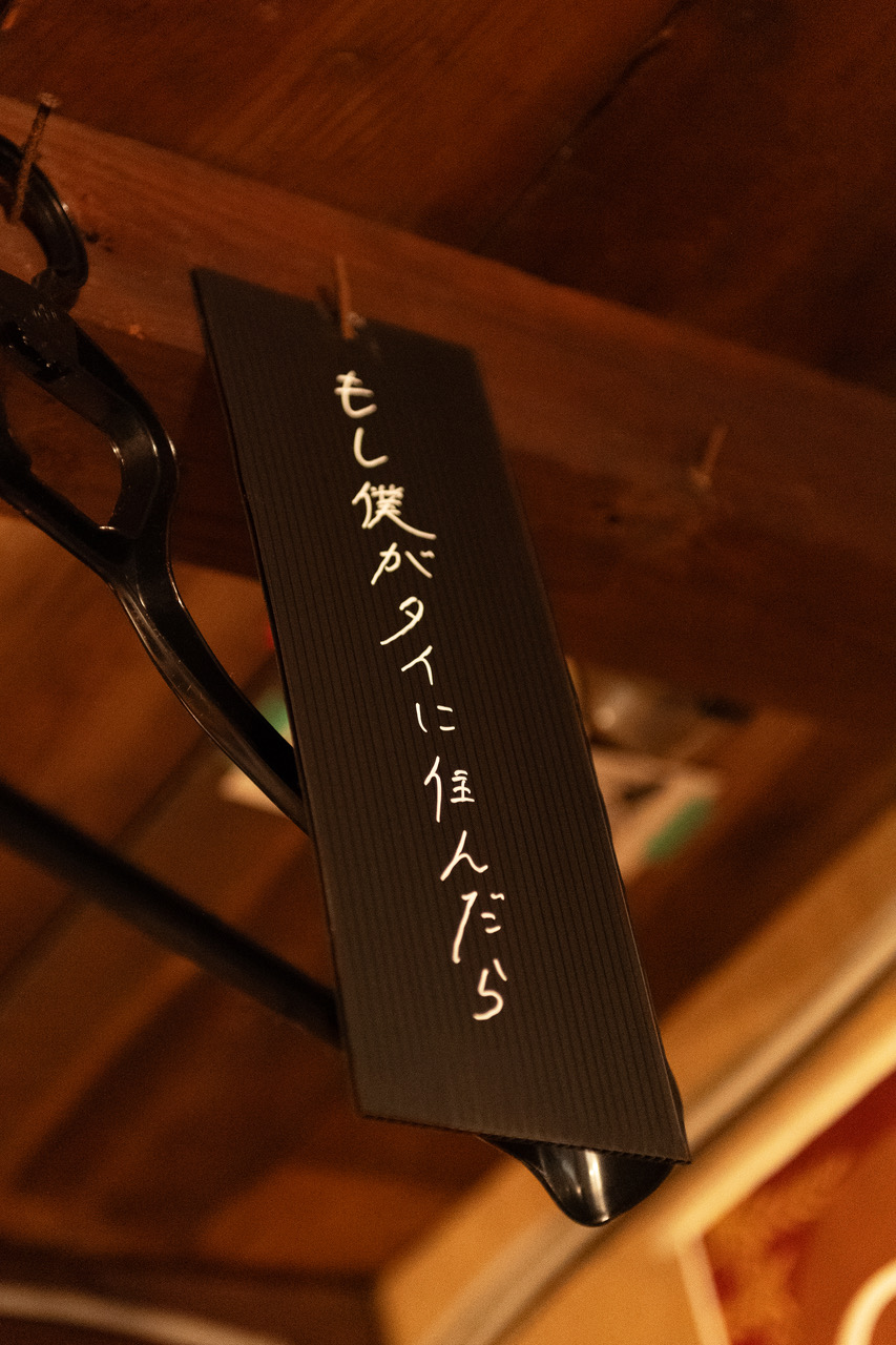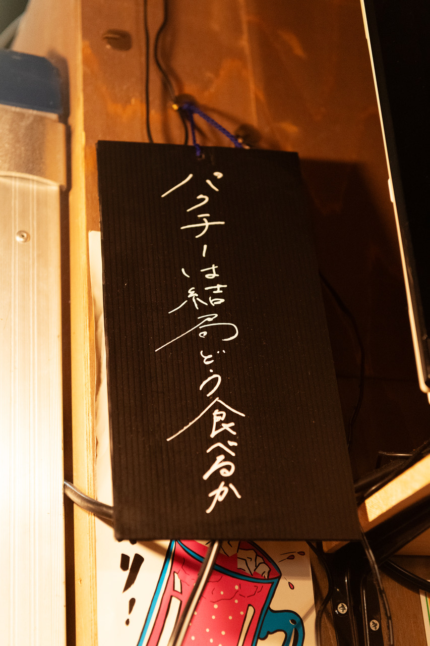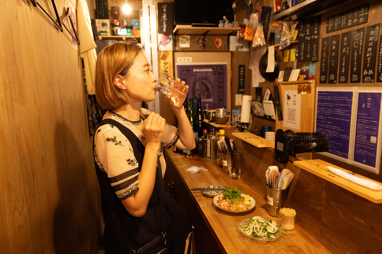 「もし僕がタイに住んだら」をコンセプトに、創作エスニック×芋焼酎のペアリングを提案する路地裏の小さな立ち飲み。少し意外な組み合わせだが、「エスニック料理特有の塩味や辛味に、芋の甘みが優しく寄り添ってくれるんです」と店主の佐々木拓朗さん。マヨネーズを使わないシャキシャキのポテサラやタマリンドソースのパッタイなど、本場の味をベースにアレンジを加えた料理はどれも新鮮な驚きを与えてくれ、「全制覇したいくらいおいしい」と植杉さんも絶賛する。黒板のメニューはTHB表記(1THB=4.6円)、店独自のルールあり……と一見クセ強だけど、ひとたび扉を開けると温もりに包まれた空間が広がり、佐々木さんの気さくなお喋りにも心がほどける。