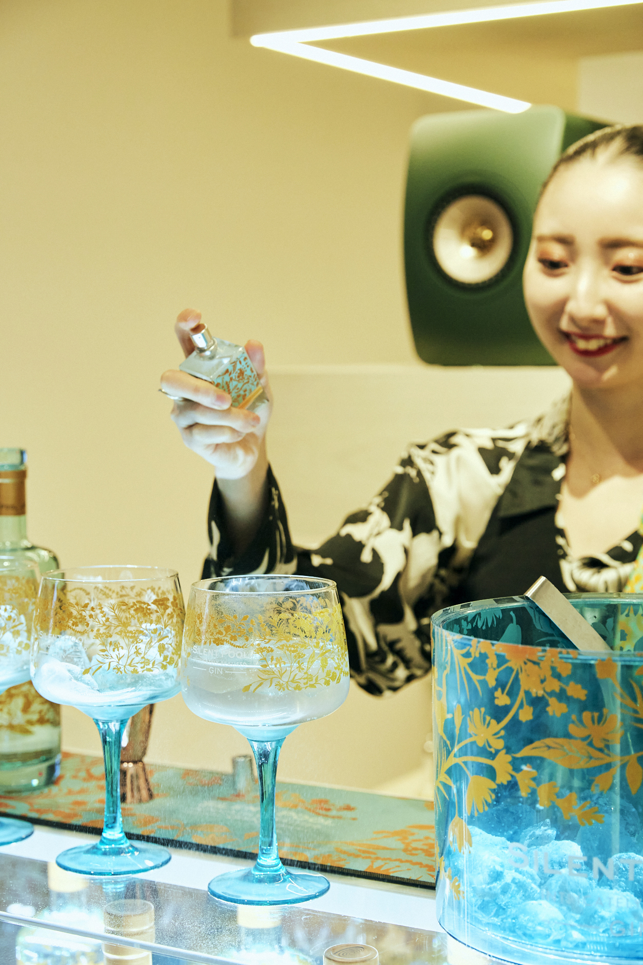 KEF Music Gallery Tokyoのビル2階に位置するThe Studioに着くと、ウェルカムドリンクとしてジントニックが用意される。ベルガモットの香りのスプレーをひと吹きすることで華やかさと香りのテクスチャーが増す。サイレントプール ジンのブランドアンバサダーでありバーテンダーの小川杏香さんが専用グラスにサーブしてくれるあいだも、KEFのスピーカーからは来場者を包み込むようにもてなすように心地よい音楽が流れている。徐々に招待者も集まったところで、本編がスタートした。