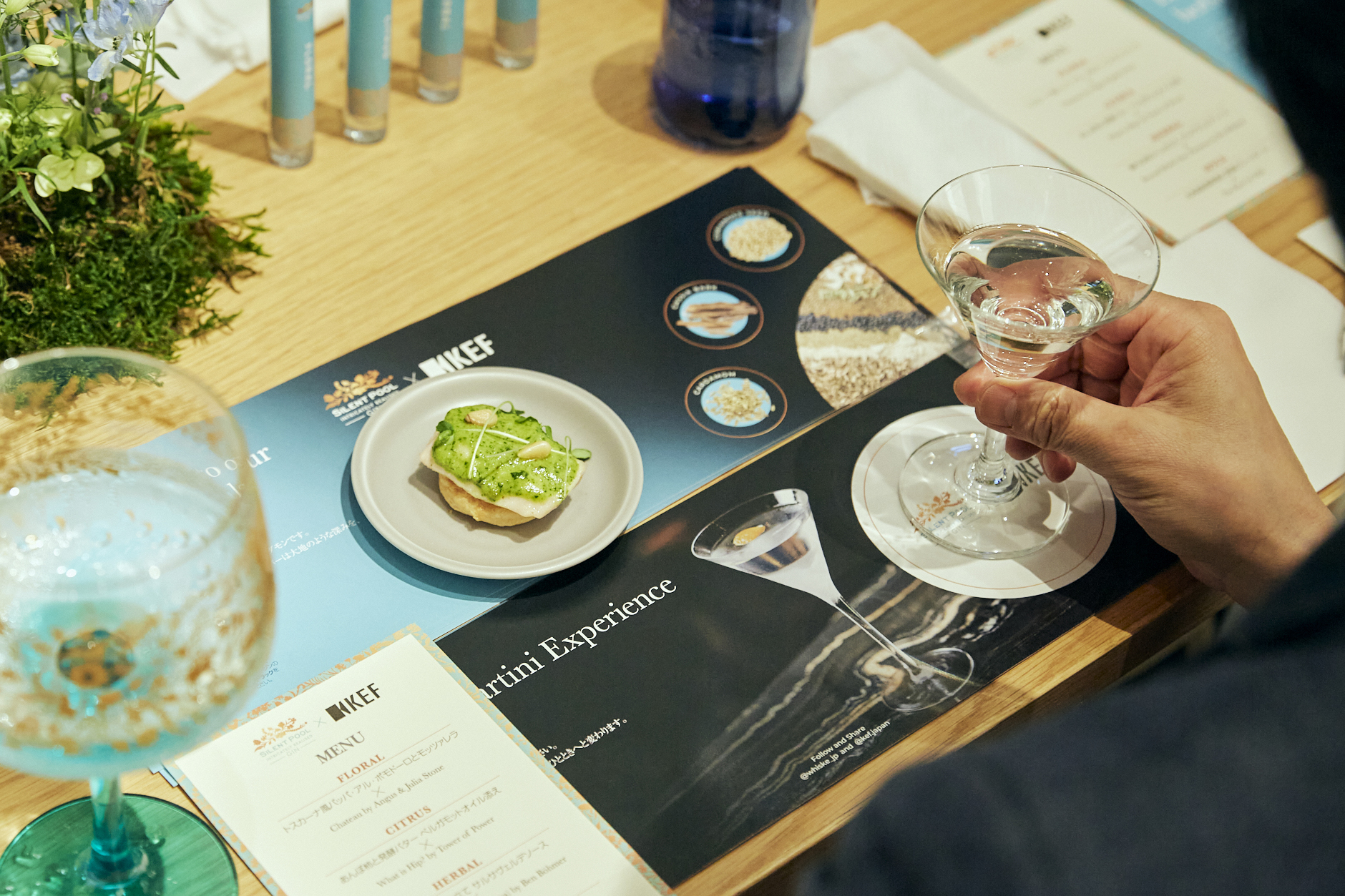The Studioに戻って次は、音楽や匂いによって味覚が変わる、というプログラムを体験する。サイレントプール ジンで作られたマティーニとペアリングされたフード、さらにフローラル/シトラス/ハーバル/スパイスという4つのアロマ、そしてそれにマリアージュするよう特別に用意されたサウンドトラックをKEFのスピーカーで聴く。高音は甘み、低音はスパイスや苦味、穏やかな音楽は舌ざわりや質感を強調してくれるというが、まさにそのとおり。招待された人々は、音楽とジンと香りと会話と空間と、それぞれを思い思いに愉しむ。なんて贅沢な時間だろう。