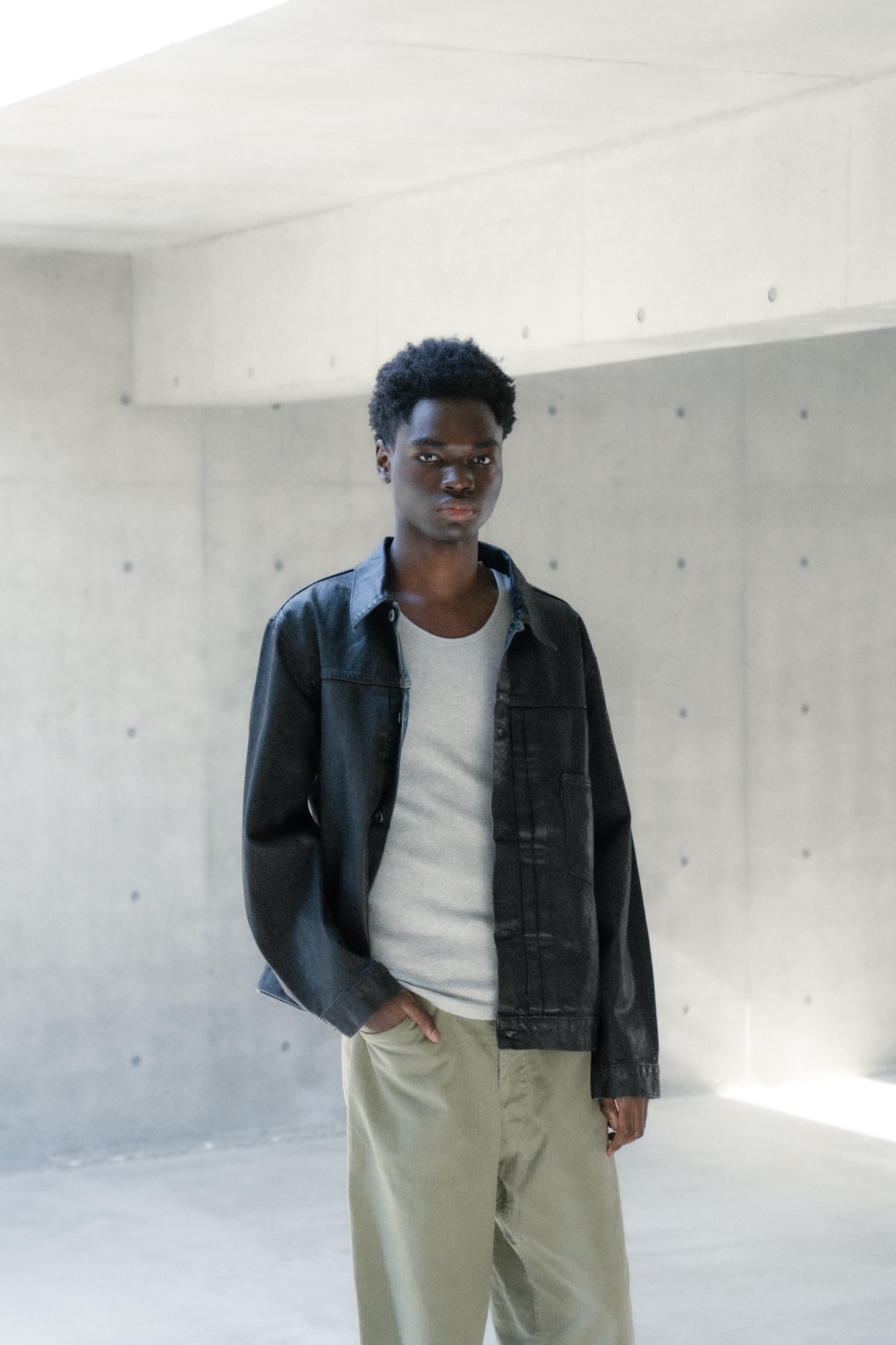 メンズとして4度目となる本別注ではLevi’s®を象徴するモデルのひとつ「TYPE I TRUCKER JACKET」を現代的に再解釈。最大の特徴は、手作業で一点ずつ施されたブラックのPTコーティングだ。