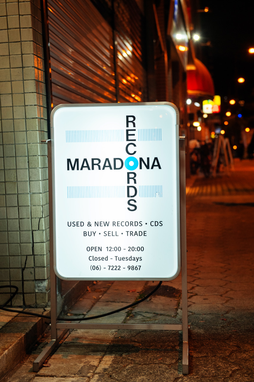 谷町六丁目駅近くのビルに入居する隠れ家的な一軒。店主のショーンさんは、アメ村の老舗中古レコード店、KING KONGで10年ほど働いたのち2021年に独立。CMさんとは15年来の付き合いだという。「家からほぼ一直線の場所にあるので、いつもふらっと遊びに来ます。ヴィンテージのマッキントッシュのアンプを使って試聴できるのが魅力で、自分で作った曲を聴かせてもらいに来ることもありますね」とCMさん。こぢんまりとした空間には、ショーンさんが愛するヒップホップ、ソウル、ファンクを中心に、オールジャンルのレコードがひしめき合い、古着のバンTやオリジナルアパレルも並ぶ。和やかにお喋りしながら慣れた手つきでディグる姿から、CMさんの穏やかな日常が垣間見えた。