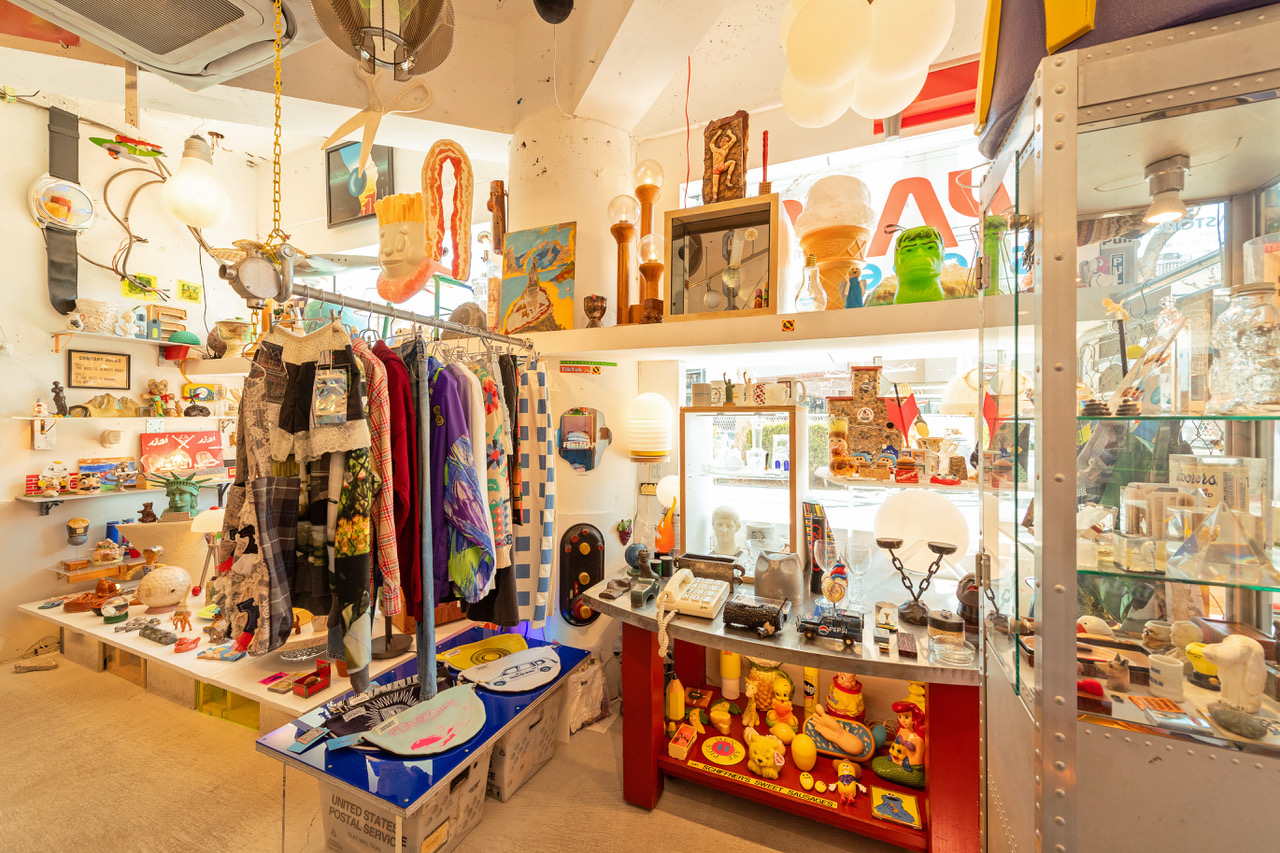 古着を中心としたアパレルとユニークな雑貨、多彩なアーティストの作品を扱うショップ。作者不明のアートや用途のわからない造形物など、「これ何なん!?」と思わずツッコみたくなるアイテムが所狭しと並び、まるでおもちゃの世界に迷い込んだような気分になる。「ささる人にはささる、ちょっとヘンテコなプロダクトが好き。お気に入りをコレクションするような感覚で、日本人にはない感性が光るものやディスプレイした時に面白いものをアメリカで買い付けています」と大吉さん&河田さん。大吉さんがディレクターを務めるAIRRとDMCをはじめ、AWA、onegaigotoなど親交のあるブランドもセレクトする。2人の独特なセンスに魅了され、熱心に通うファンも多い。