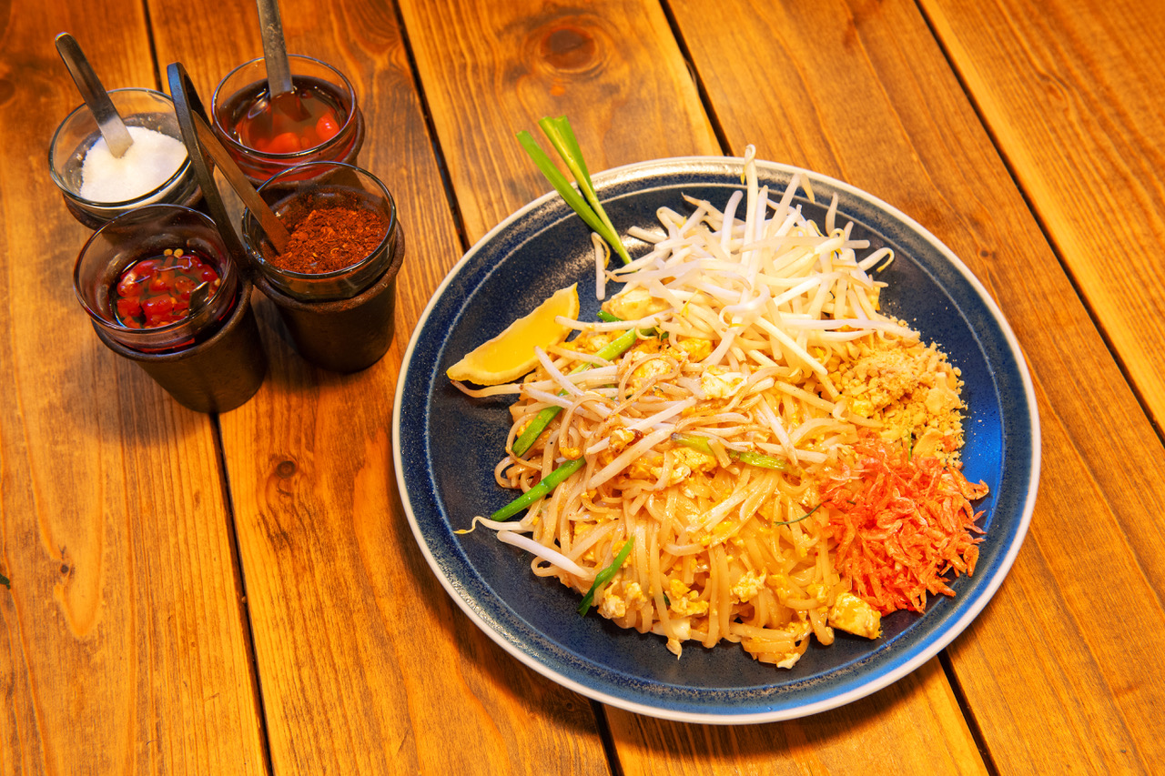 中崎町の閑静な住宅街にひっそり佇むこちらは、京都のタイ料理店で腕を磨いたバンコク出身のジャックさんが手掛ける人気店。トムヤムクンやタレーパッポンカリーなど、本場の名物料理を時間帯問わずアラカルトで味わえる。看板メニューは、タイの定番屋台料理として親しまれるパッタイ。現地から仕入れるもっちりとした麺に、シャキシャキの生もやしやカリッと香ばしいナッツの食感が重なり、干しエビの豊かな香りと旨みがアクセントに。卓上に用意されたナンプラーや唐辛子酢、砂糖といった調味料で、自分好みに味変できるのも楽しい。「タイ料理を日常的に楽しんでほしい」という思いから、ランチタイムはパッタイを800円で提供。本格的な味を気軽に体感できる。