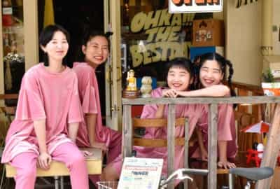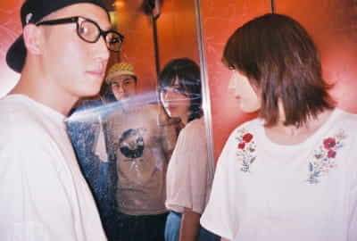 その存在感で見る者を虜にする双子のマナ・カナと、タイトなドラム&ブリブリのベースというリズム隊が起こすCHAIワールド。選んだTシャツは全員、どこかクセのある古着。ルーズなサイジングで着こなし、独特ながら自分のものにしているのは彼女たちの音楽も然り、だ。L to R ユウキ[Ba.&Cho.]、マナ[Vo.&Key.]、カナ[Vo.&Gt.]、ユナ[Dr.&Cho.]
