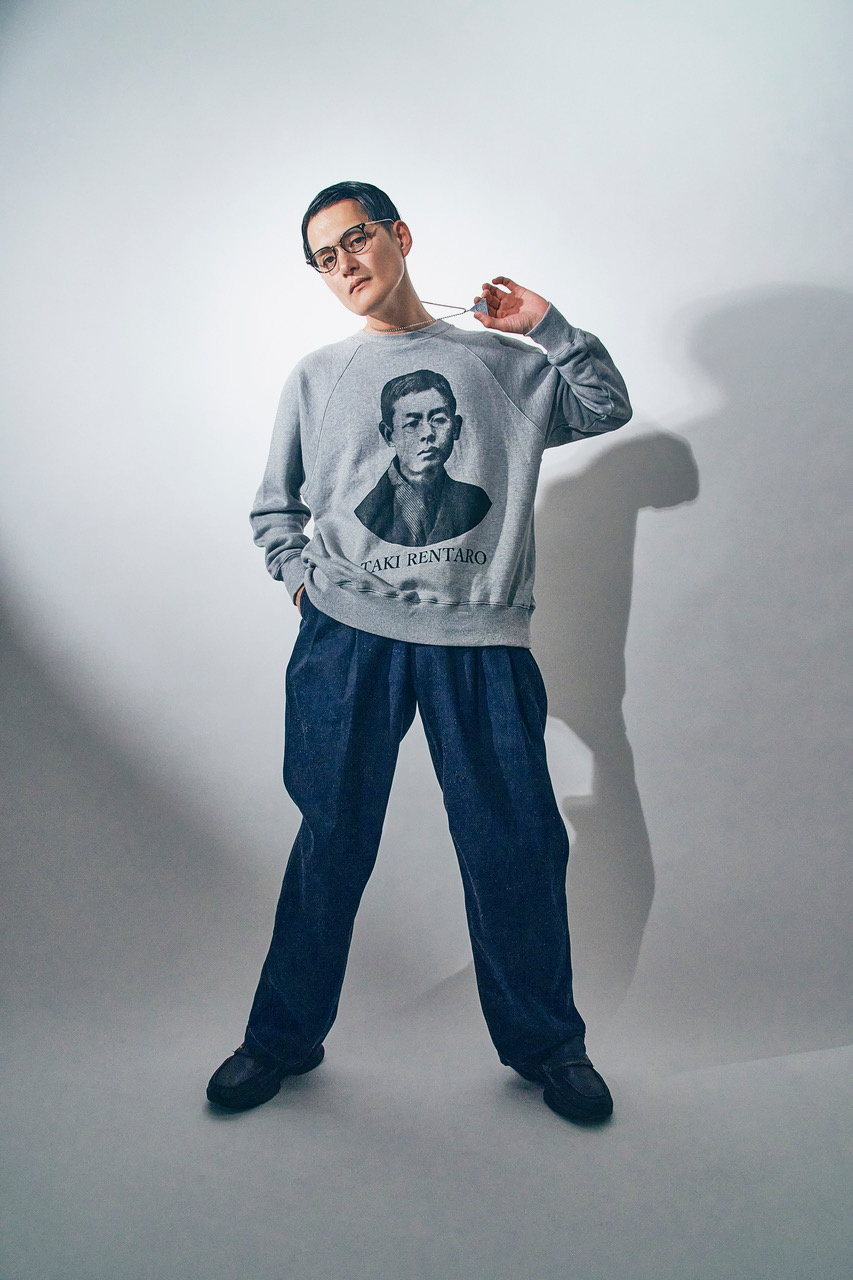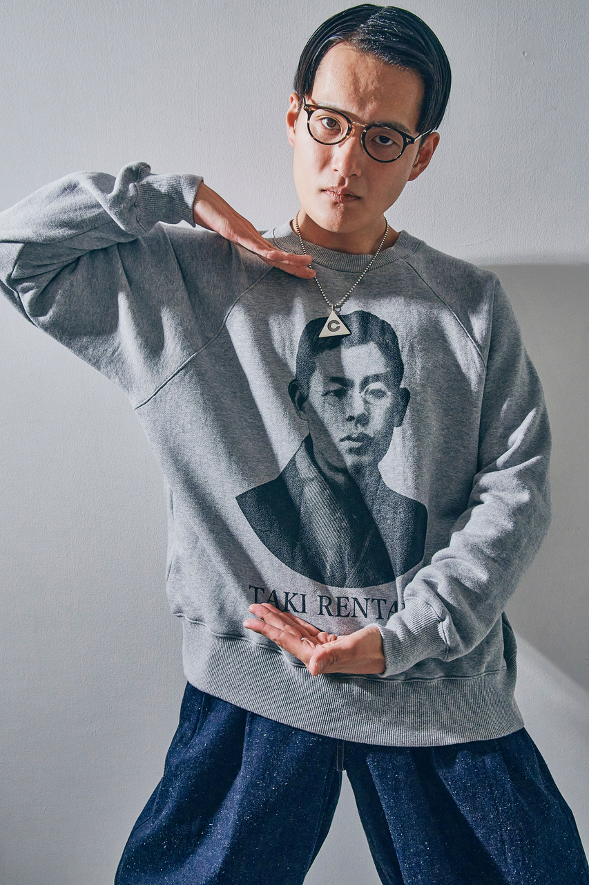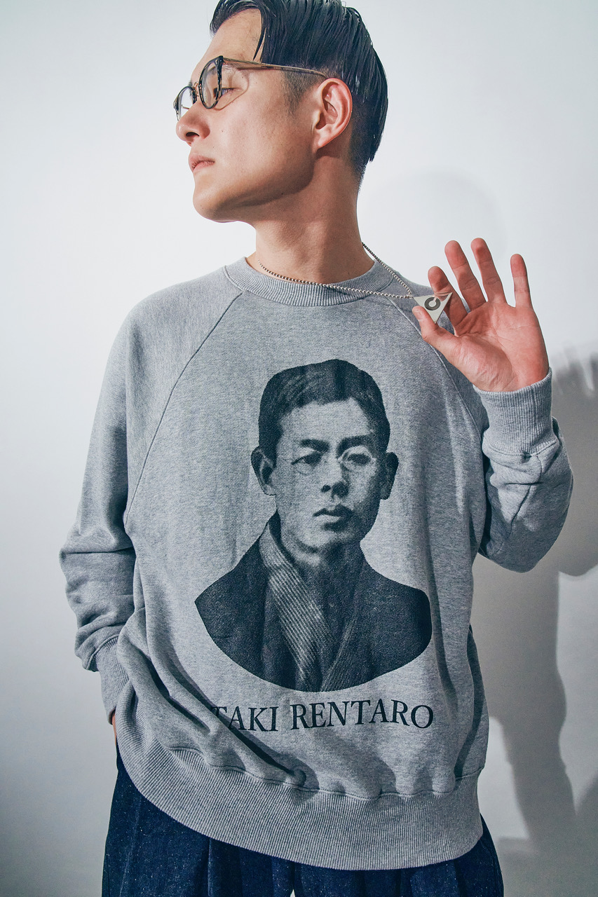 日本の近代音楽黎明期を牽引し、わずか23歳で夭折するまでに「荒城の月」や「鳩ぽっぽ」など数々の名曲を遺した日本を代表する音楽家、瀧廉太郎。教科書でおなじみの“あの”肖像をラグランスリーブのスウェットに大胆にプリントした本作は、1960年代のベートーヴェンやバッハの肖像を配した「音楽家スウェット」を、日本的に再解釈したデザインとなっており、クラシックの威厳とユーモアをストリートに昇華した、同ブランドのマスターピースと言える一着だ。