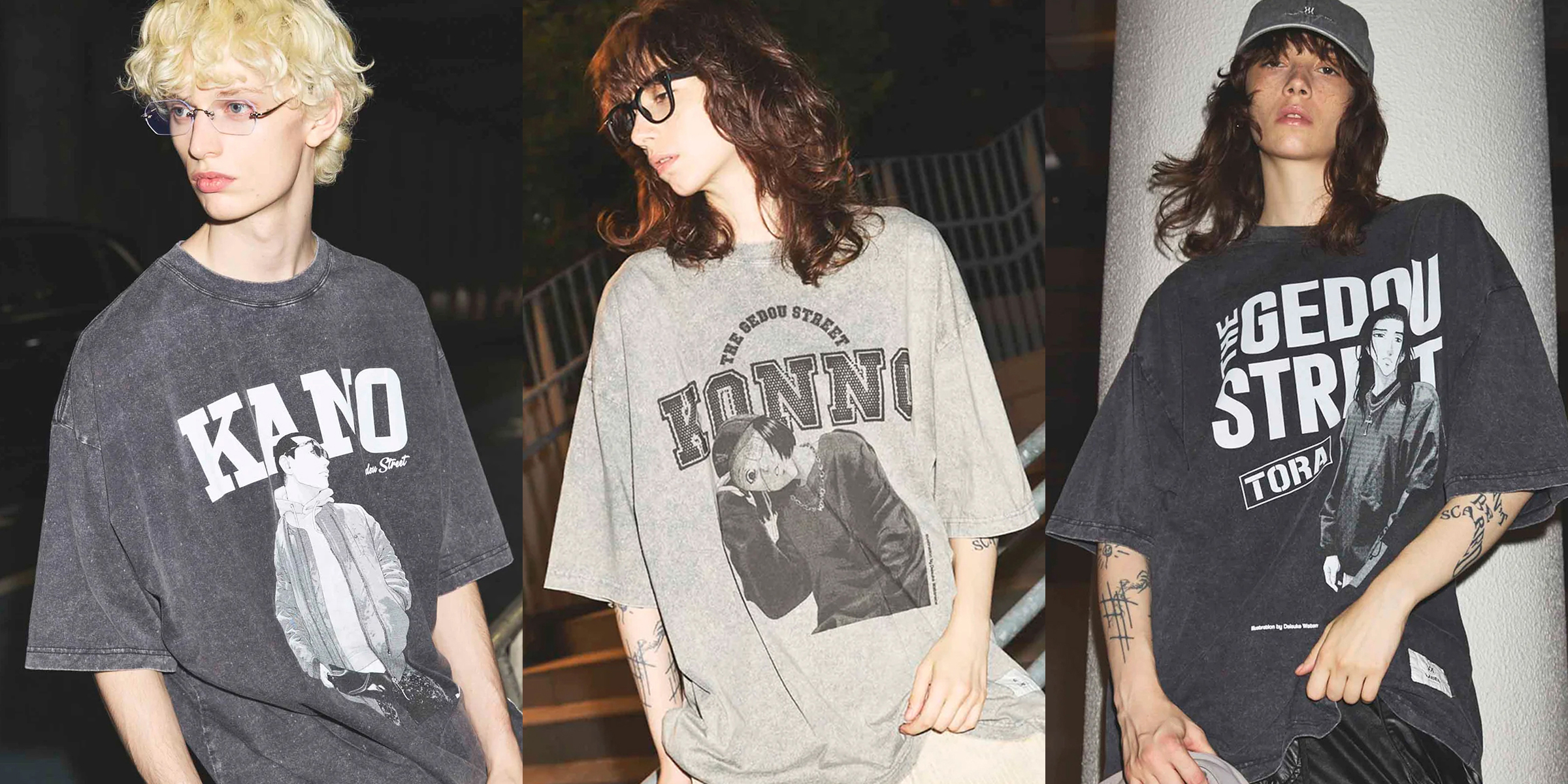 今回のコラボレーションのテーマは『GEDOU STREET COLLECTION』。作中では見られないストリートウェアをまとったカモ、トラ、近野を描き下ろしたイラストにロゴを組み合わせたグラフィックが印象的だ。さらに、製品硫化染めとケミカルウォッシュを施すことで、ヴィンテージライクな風合いに仕上げたTシャツがラインナップする。他では手に入らない唯一無二のコレクション。その世界観をぜひ体感してほしい。