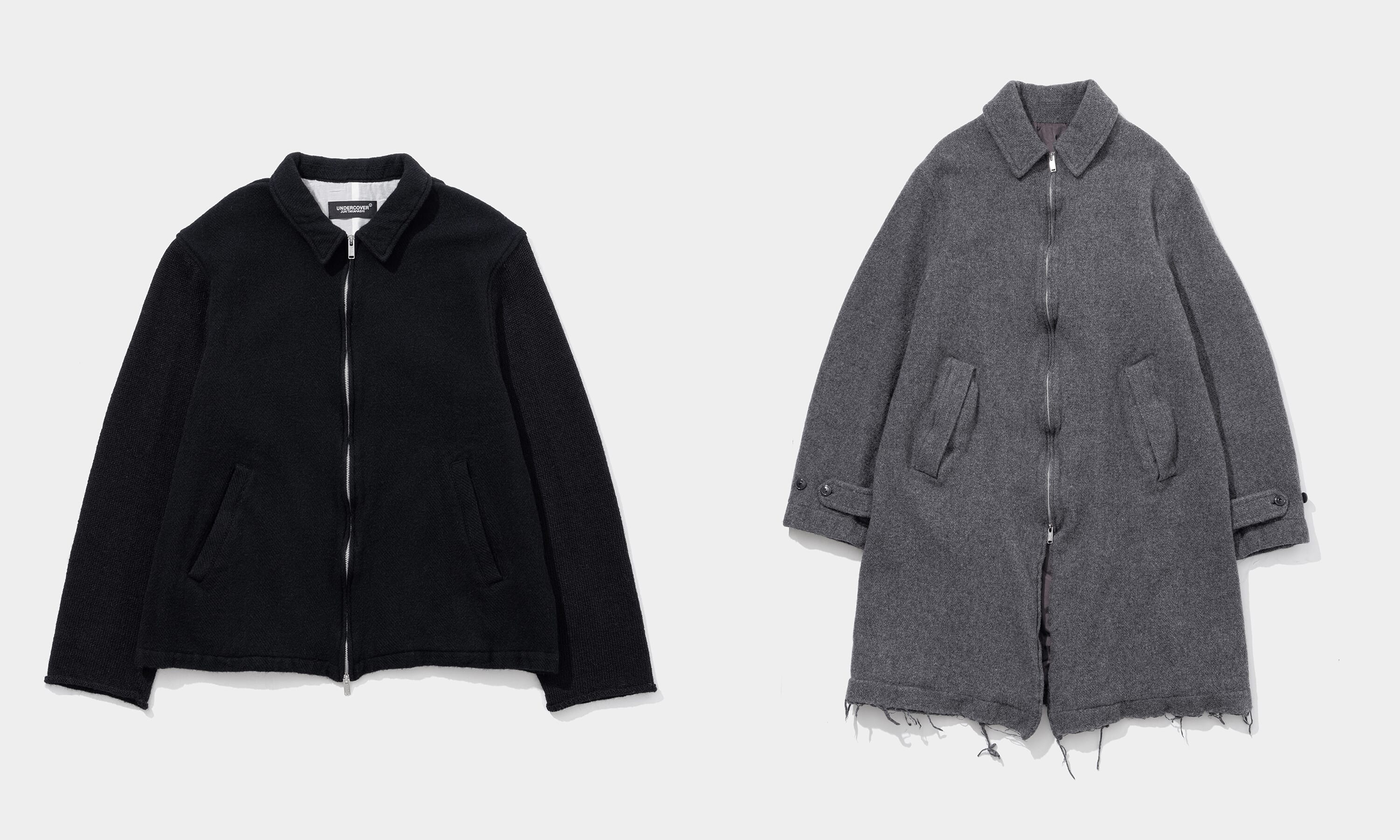 昨年原宿にオープンしたコンセプトストアV.A.が、UNDERCOVERとの初の別注アイテムとなるアウター2型をリリースした。UNDERCOVERの2025年AWメンズコレクションからピックアップした、ジップアップブルゾンとジップアップステンカラーコートをベースに、通常コレクションとは異なるテキスタイルを使用。無地のブラックやグレーで仕上げることで洗練度を高めている。