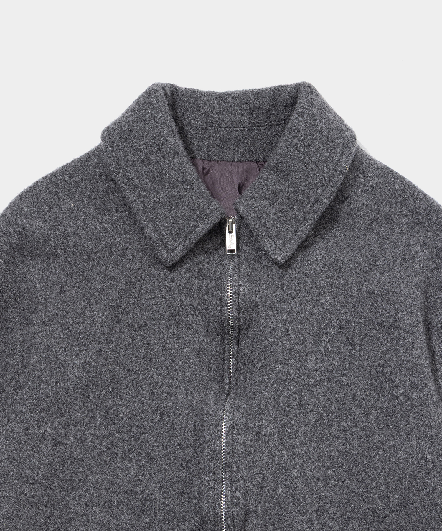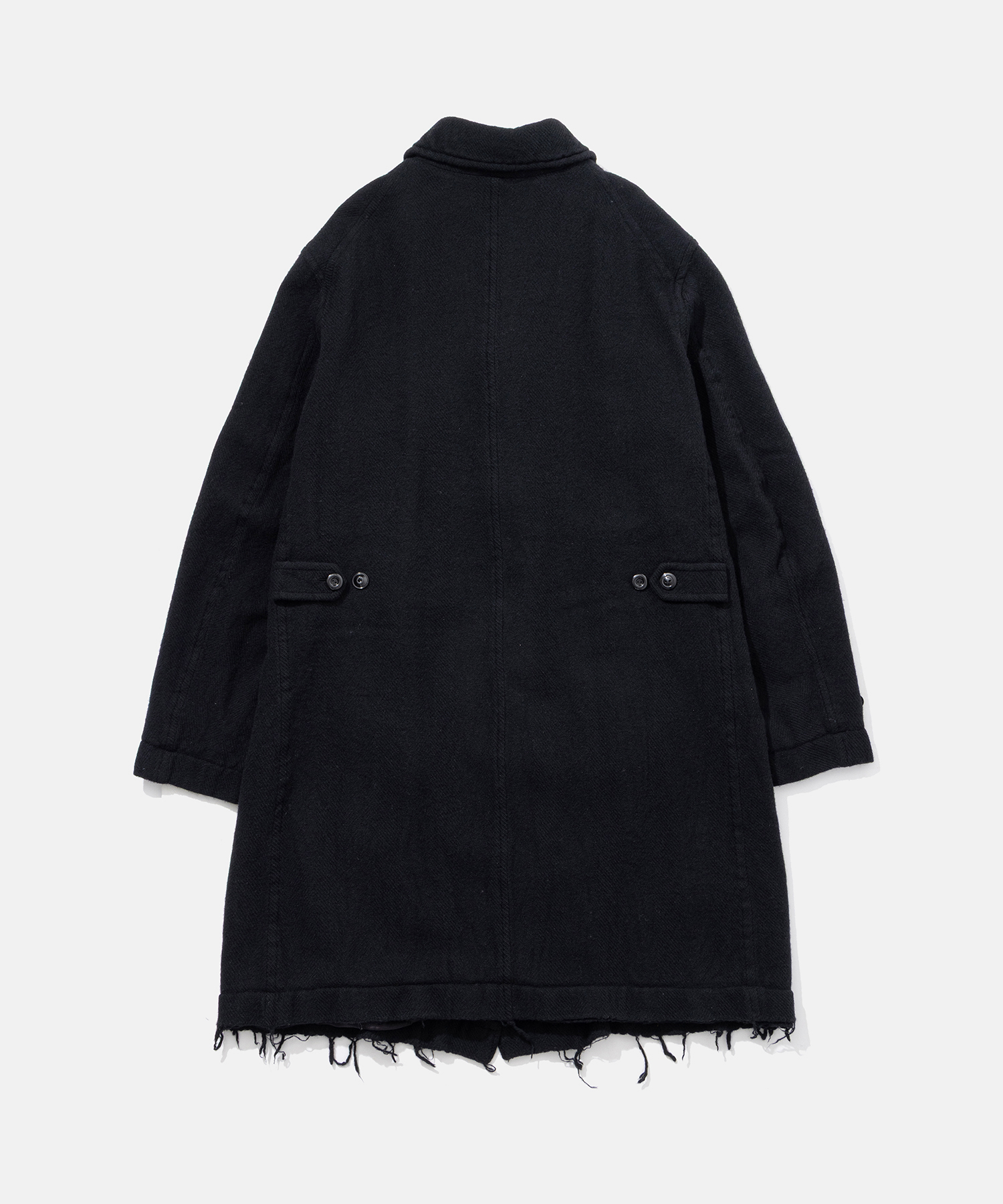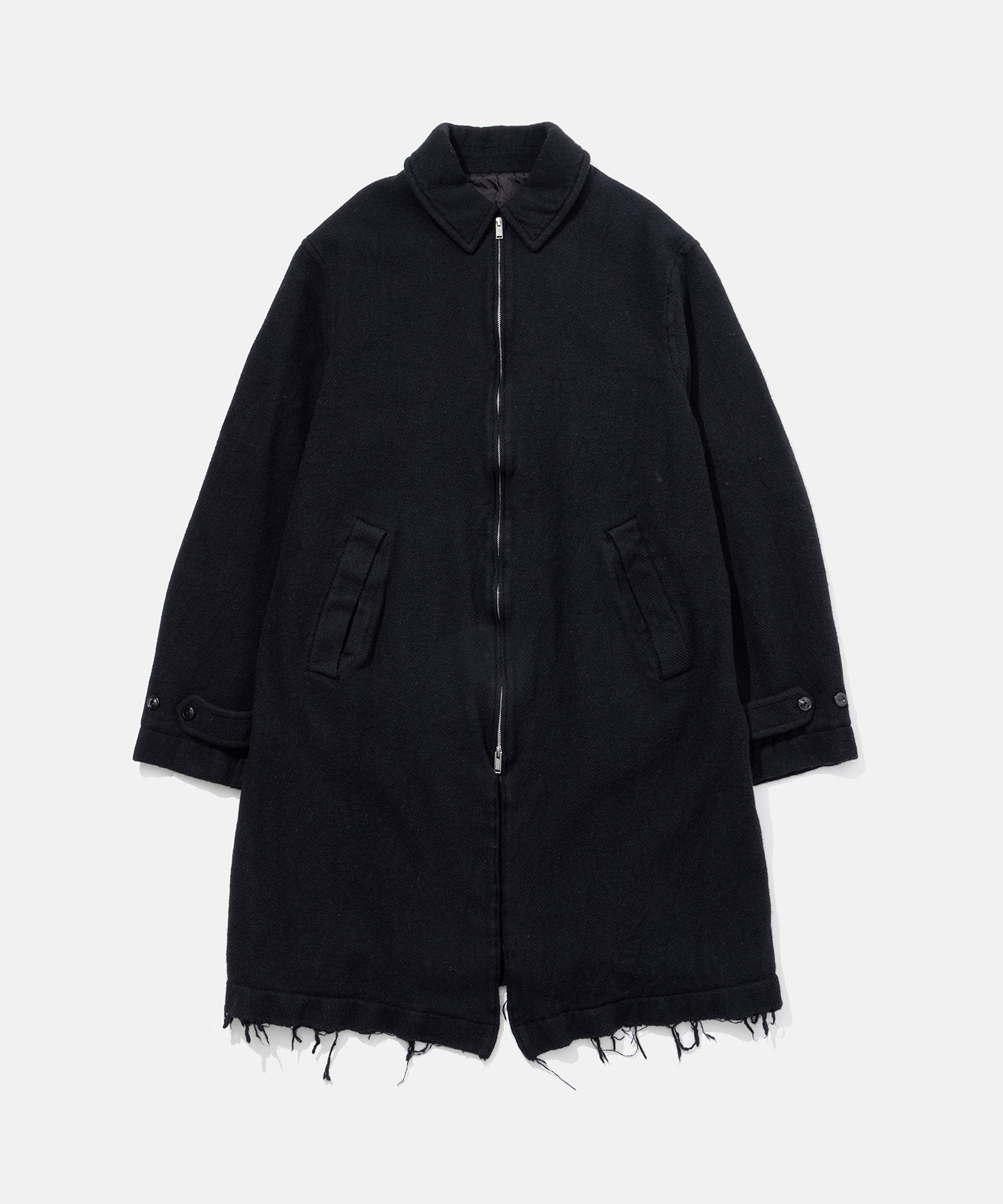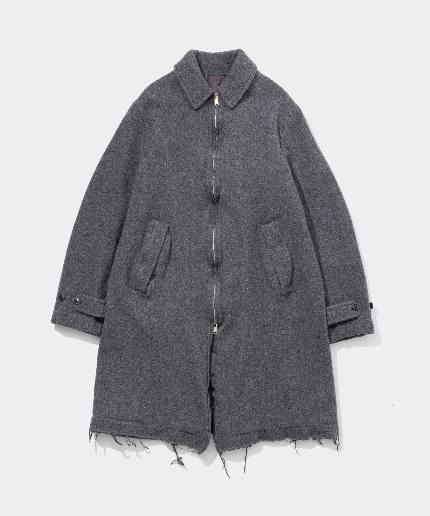 こちらはジップアップステンカラーコート。高密度に縮絨加工された上質なウール素材を使用しているため、耐久性も保温性も高く、冬でも暖かく過ごせる。切りっぱなしになったデザインも特徴的。