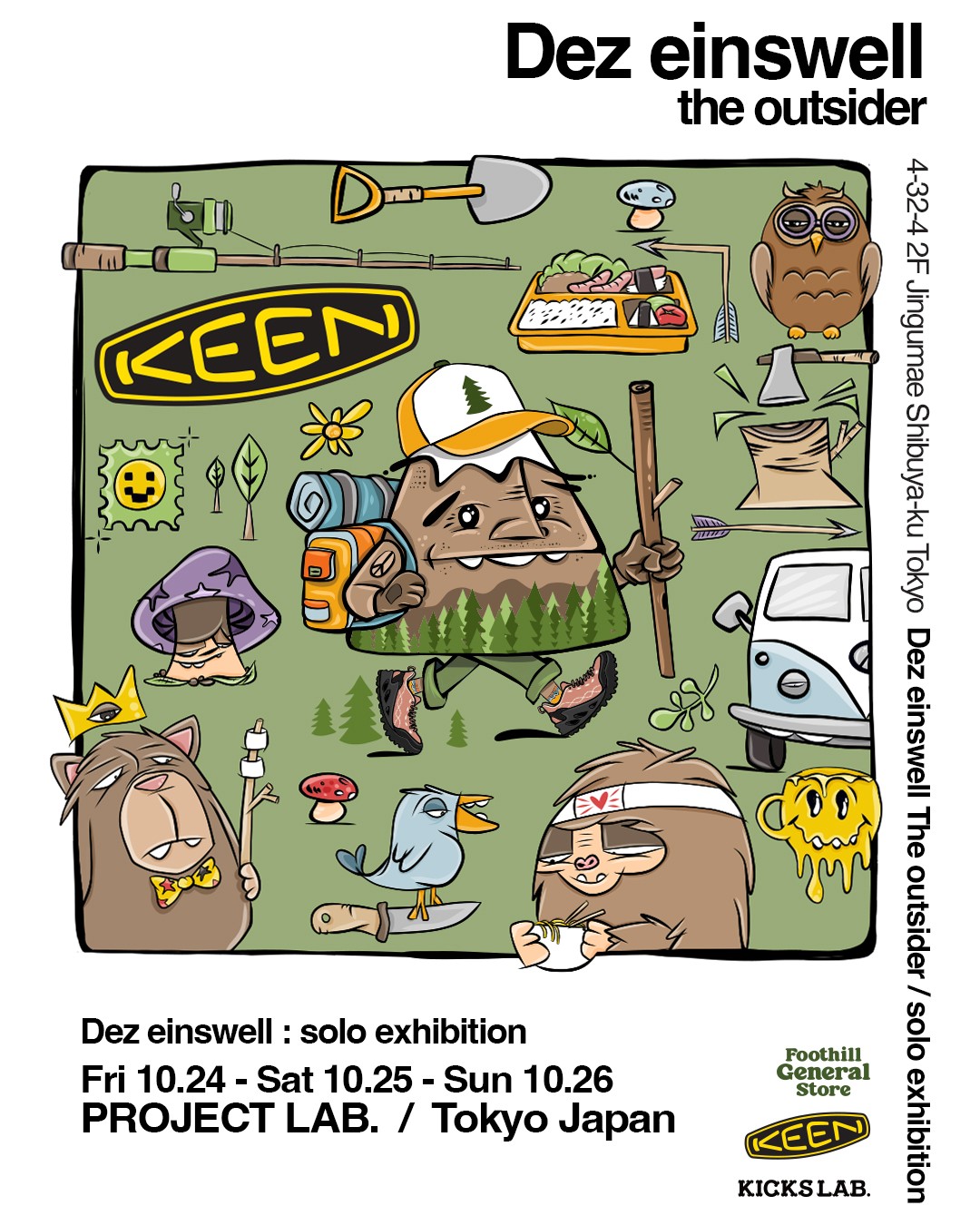 さらに、今回の発売を記念し、メインビジュアルを手がけたロサンゼルス在住のアーティスト、Dez Einswellによる東京初のソロエキシビジョンが開催される。会期初日の10月24日(金)からは、PROJECT LAB.およびKICKS LAB.原宿店にて、エクスクルーシブモデルの先行販売もスタート。来場者にはイベント限定デザインのスペシャルステッカーが配布され、会期中にKEEN商品を購入した方には、先着でオリジナルノベルティがプレゼントされる。