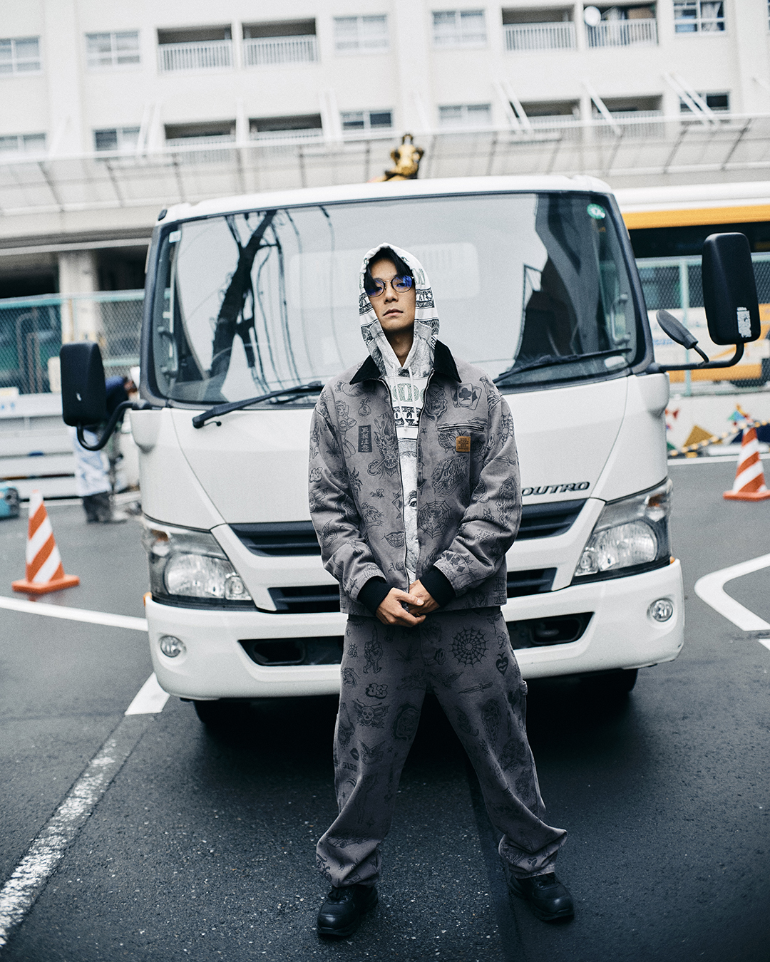今季もブランドを象徴する“OG-LABEL”ロゴや“取扱注意”のラベルを基軸としたプロダクトが多数登場する。タトゥーアーティストが描いたデザインによるダック地の総柄ワークジャケットはデニムとセットアップで。ブランドオリジナルのキャラクター“OG-BOY”をバックに掲げたジャケットやダウンジャケット、MA-1といったヘヴィアウターの他、リアルツリーカモやレオパード柄など総柄のトップス、艶感のあるジャージーのセットアップなどもラインナップ。