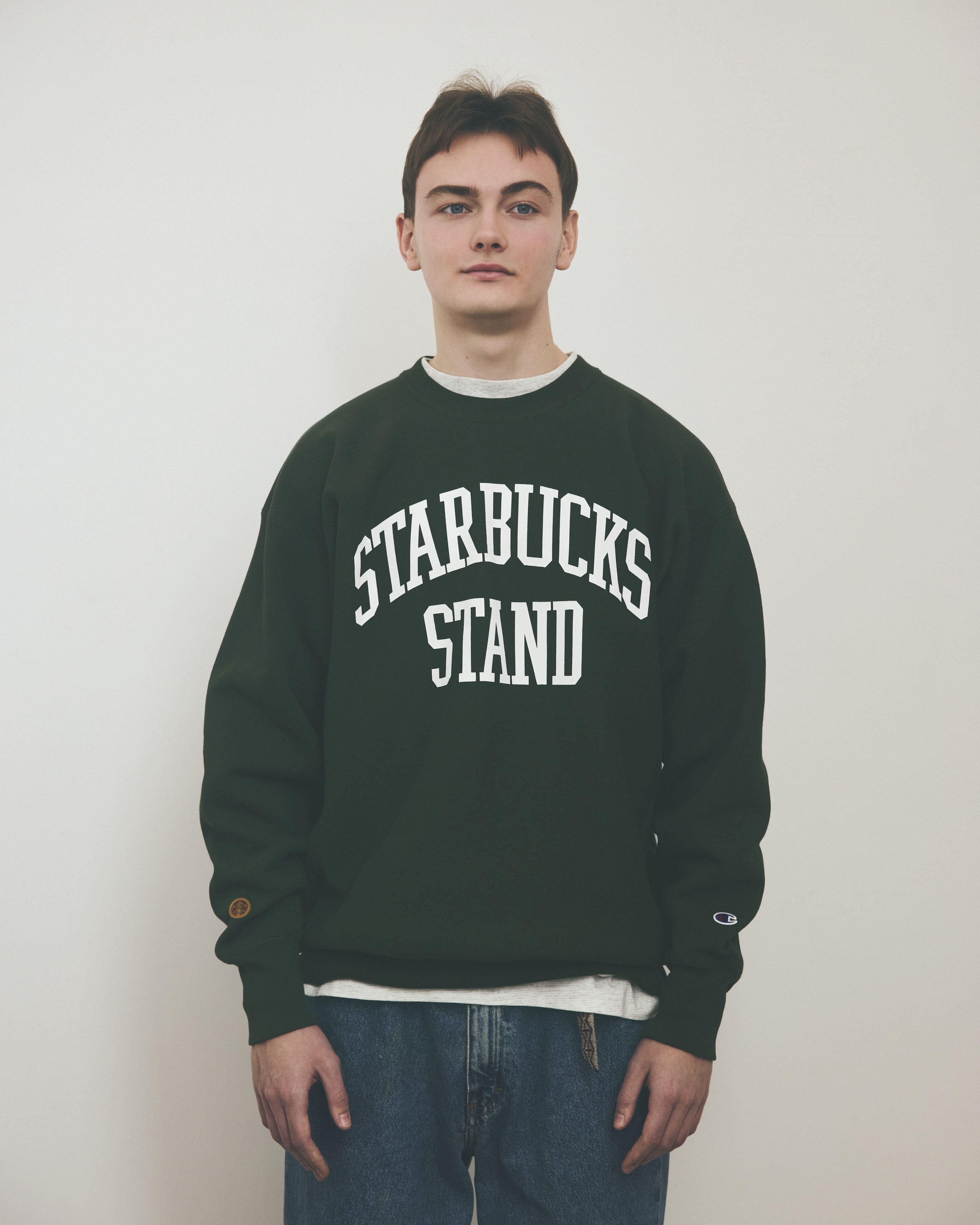 デザインは、カレッジ風フォントで「STARBUCKS STAND」のロゴをフロントに大胆にプリント。クラシックな佇まいの中に、現代的なフレッシュさを感じさせるルックに仕上げられている。右袖には〈STARBUCKS STAND by BEAMS〉のオリジナルレザーロゴパッチが配され、別注モデルとしての特別感もしっかりと押さえた。