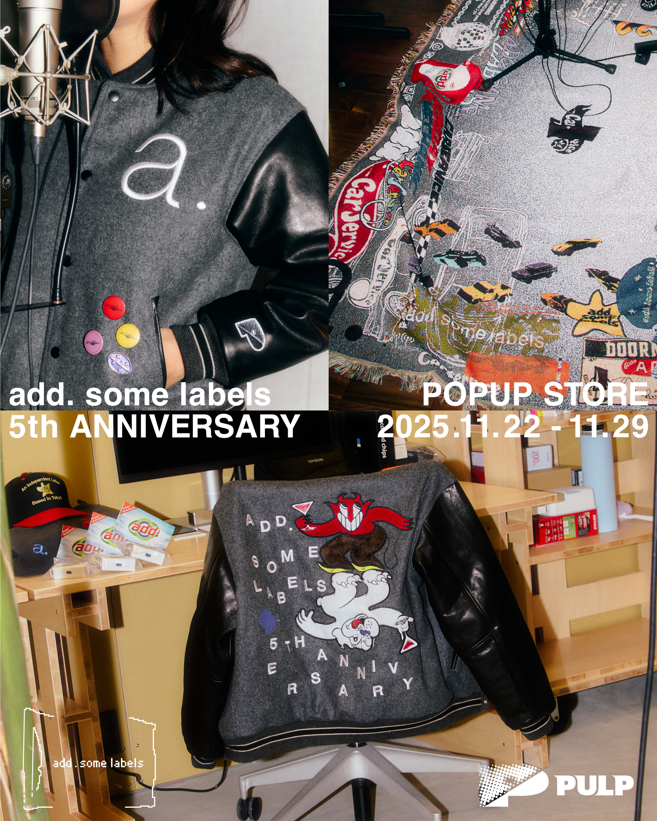 add. some labelsは(sic)boyやuinを擁する音楽レーベルであり、アートコレクティブとしても展開されている。同時に、過去にはblock.fmでの番組『ADD.SOME RADIO』を展開するなど、様々な取り組みを行ってきた。そんなadd. some labelsの設立5周年を記念し、渋谷のセレクトショップPULPで11月22日から29日までの間、ポップアップが開催される。