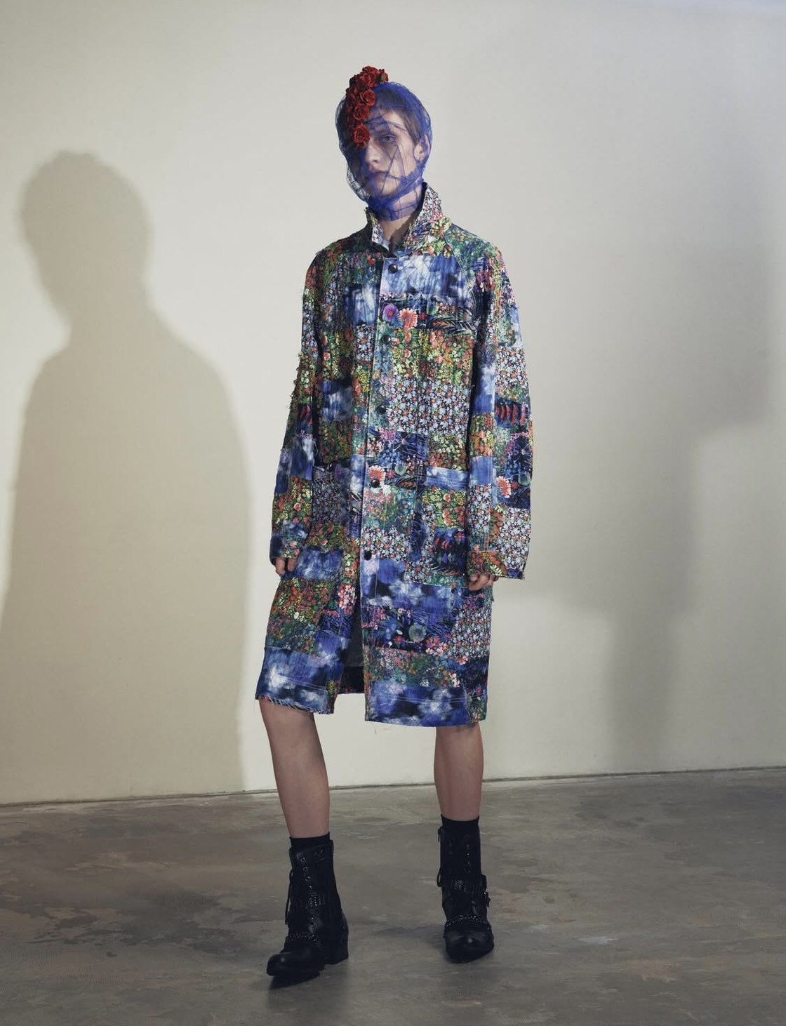 深民尚:リバティプリントを5種類、切ったり割いたりしてパッチワークしてクロスステッチをかけキルトにした生地に洗いをかけて一枚物のスプリングコートに仕上げています。