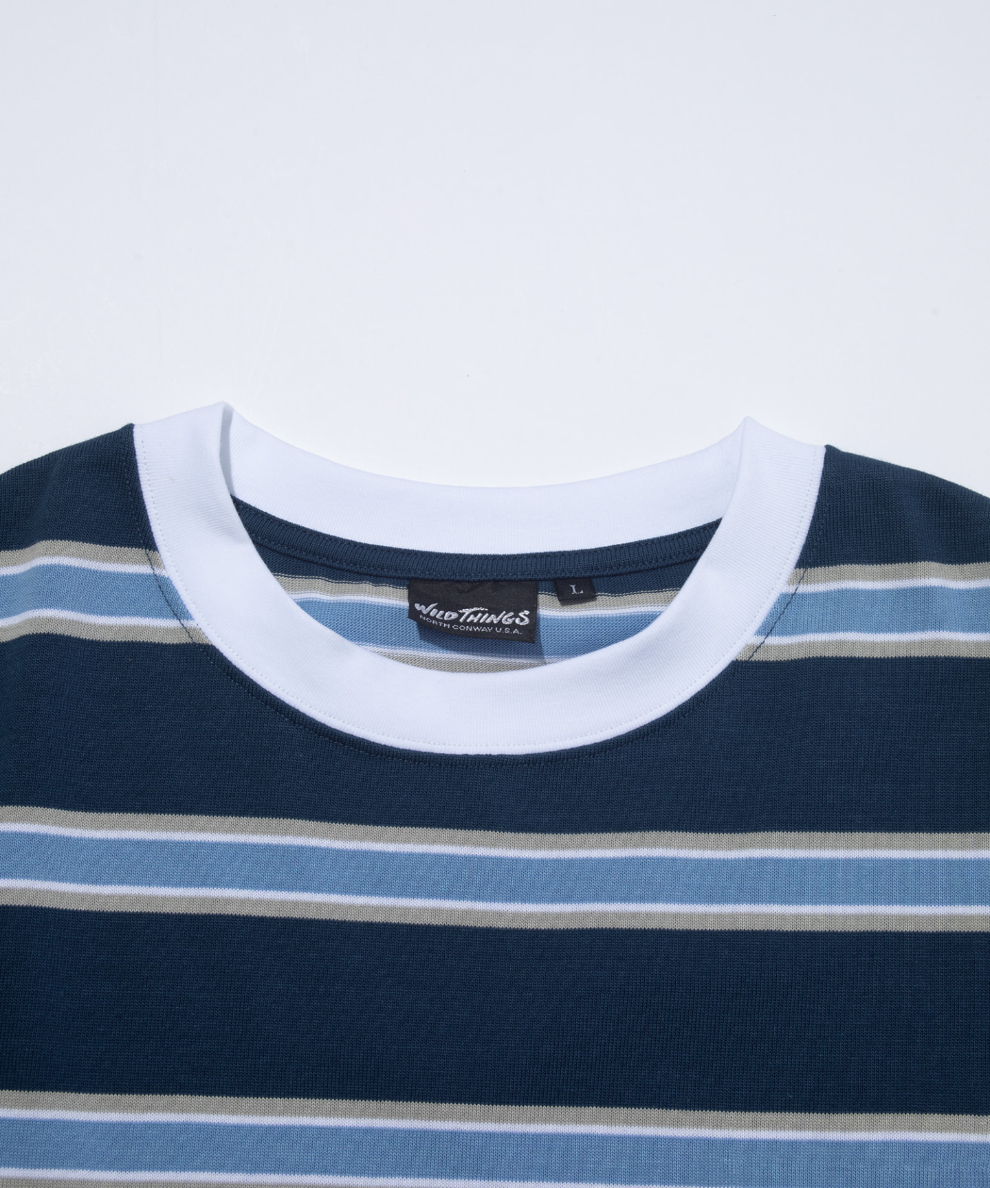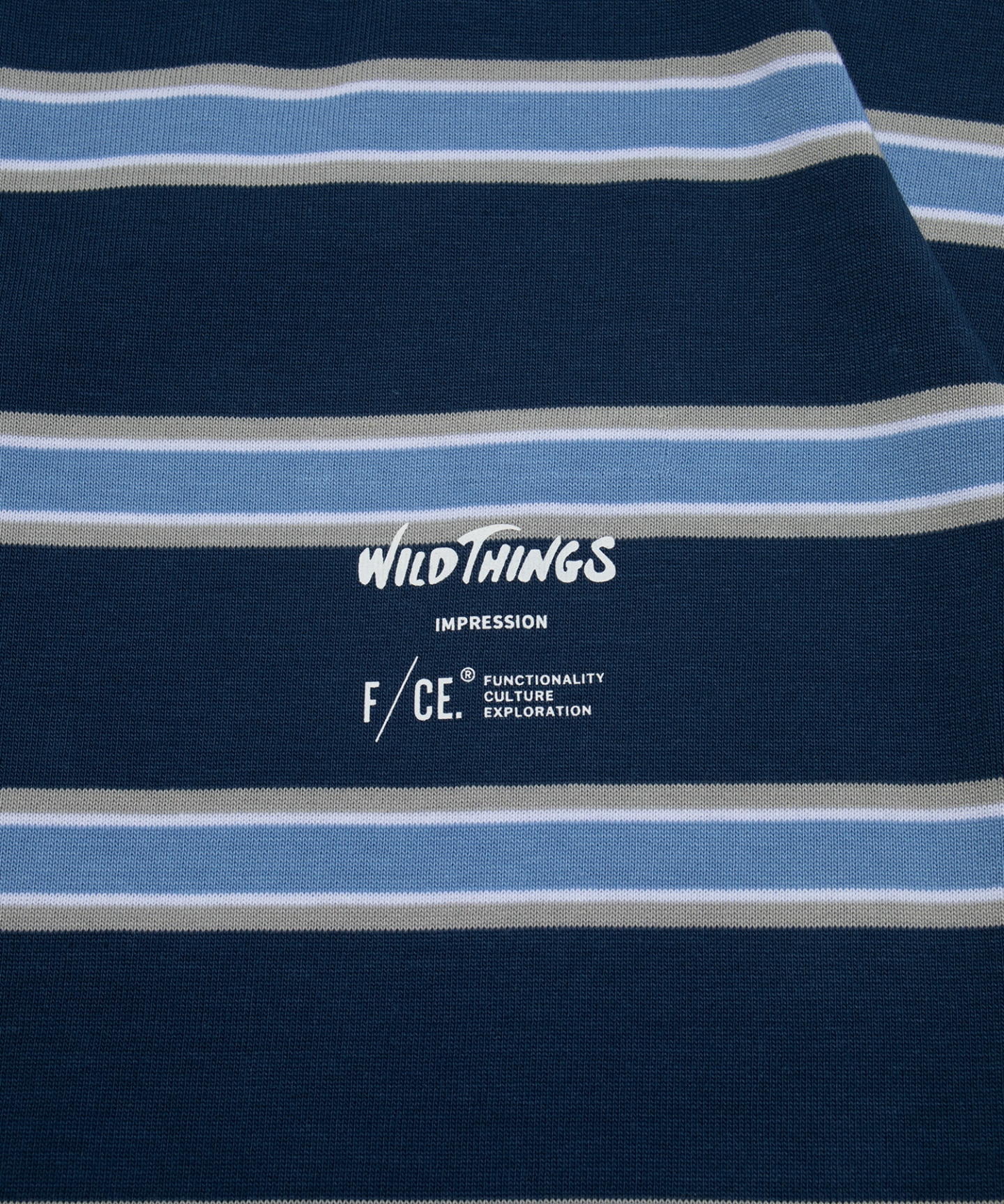 WILD THINGSが誕生した1981年当時の空気感をF/CE.の視点で再構築したボーダーTシャツ。80年代のアメリカに見られたアウトドア黎明期の勢いや自由な空気感を表現している。綿65%・ポリエステル35%のCVC素材を使用し、肌触りの良さと速乾性・軽さいった利便性を両立させた。1枚でも、レイヤードしてもバランス良く着られるセミオーバーサイズに仕上げている。