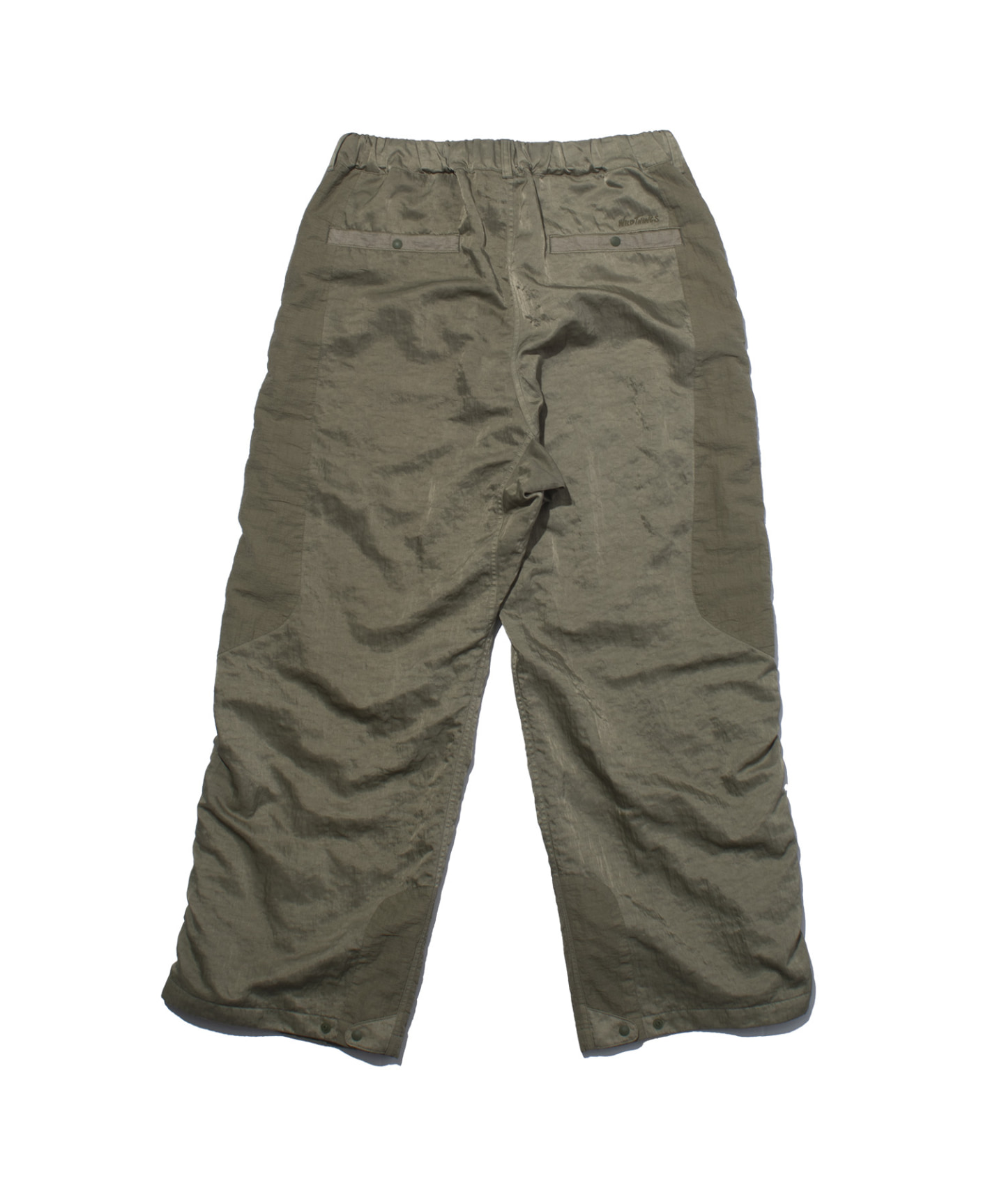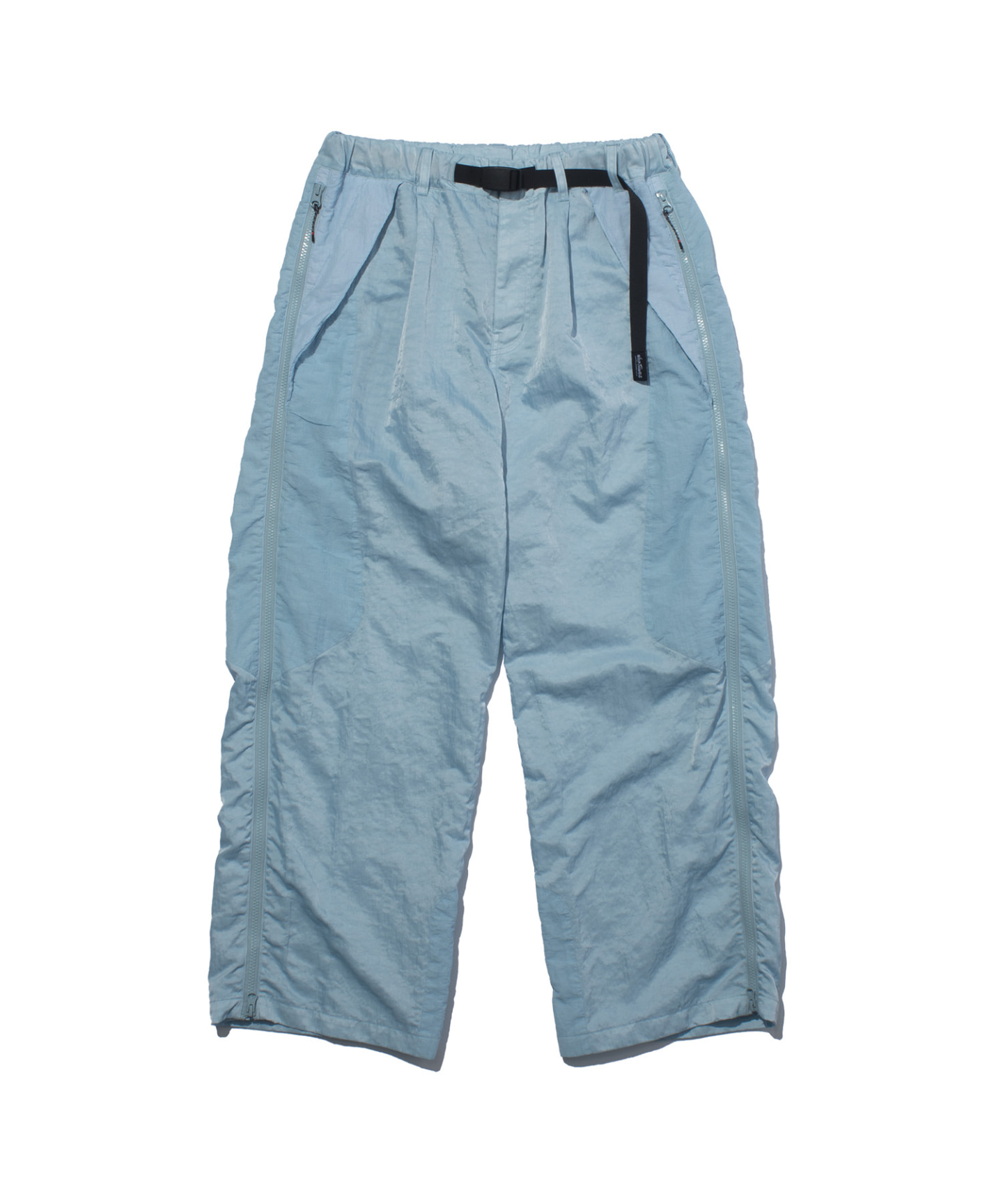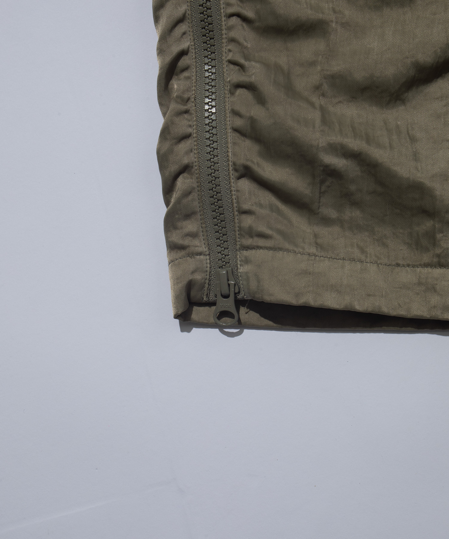 ジャケットとセットアップで着られるパンツ。こちらは製品染めを施しており、一点一点異なる風合いと奥行きのある色合いが魅力だ。また染色後に、シルクのような上品な光沢感が現れる加工も加えている。サイドや裾のジップ、ドットボタンでシルエットのアレンジが楽しめるのもポイント。