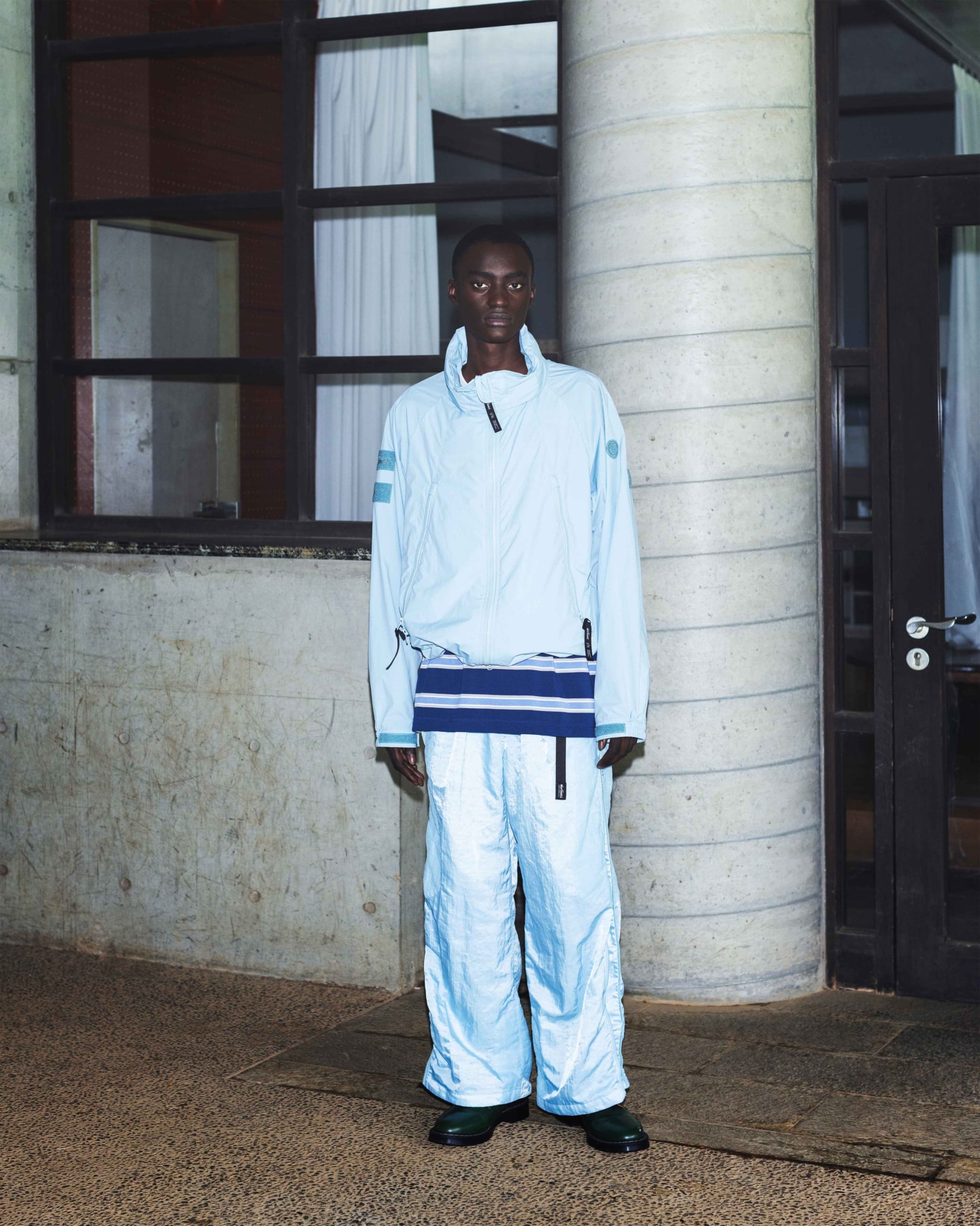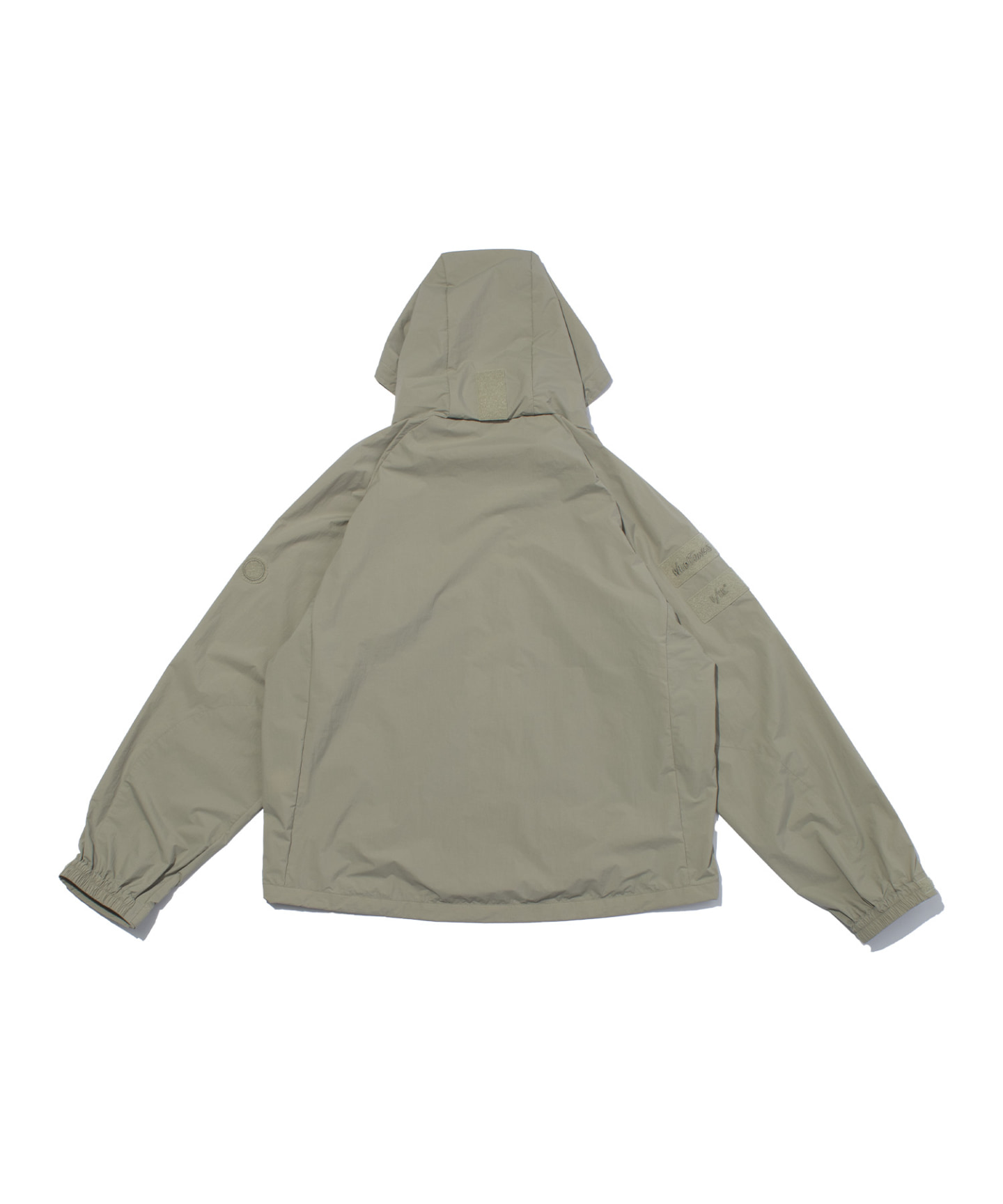 ナイロン100%の高密度生地を使用したジャケットは、裏面に通常よりも厚いアクリルコーティグを施し、独特のハリ感と構築的なフォルムを実現している。突然の雨にも安心の撥水加工付き。生地を先染めすることで深みのあるカラーや風合いに仕上げている。