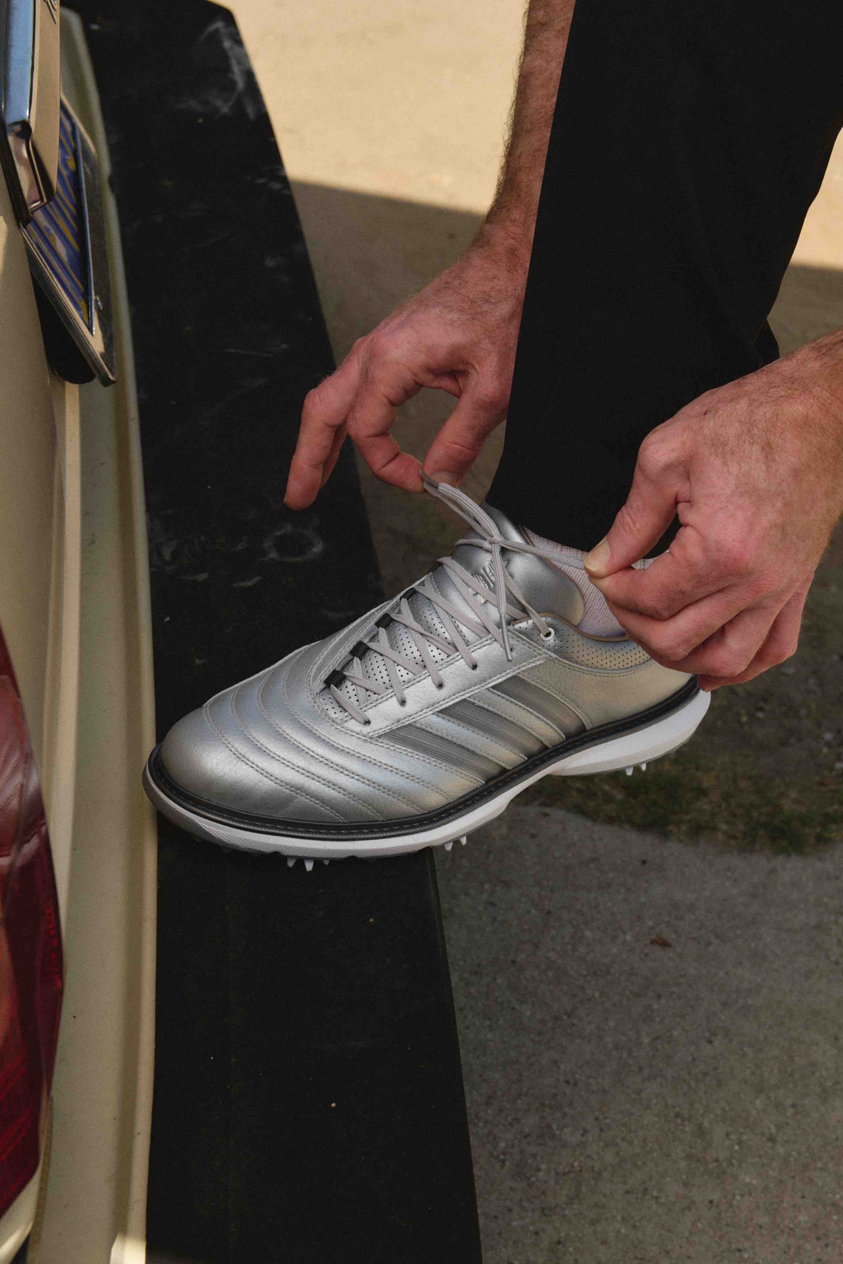ジッパー式ベンチレーションを脚部に備えたゴルフパンツは、開くとスリーストライプスが現れる仕様に。ポロシャツには2000年代半ばのadidas「Teamgeist」デザインへのオマージュがさりげなく落とし込まれている。さらに、MC70には1970年代のサッカーブーツから着想を得た、レザーアッパーのデコステッチを採用し、スポーツヘリテージを現代的に再解釈している。