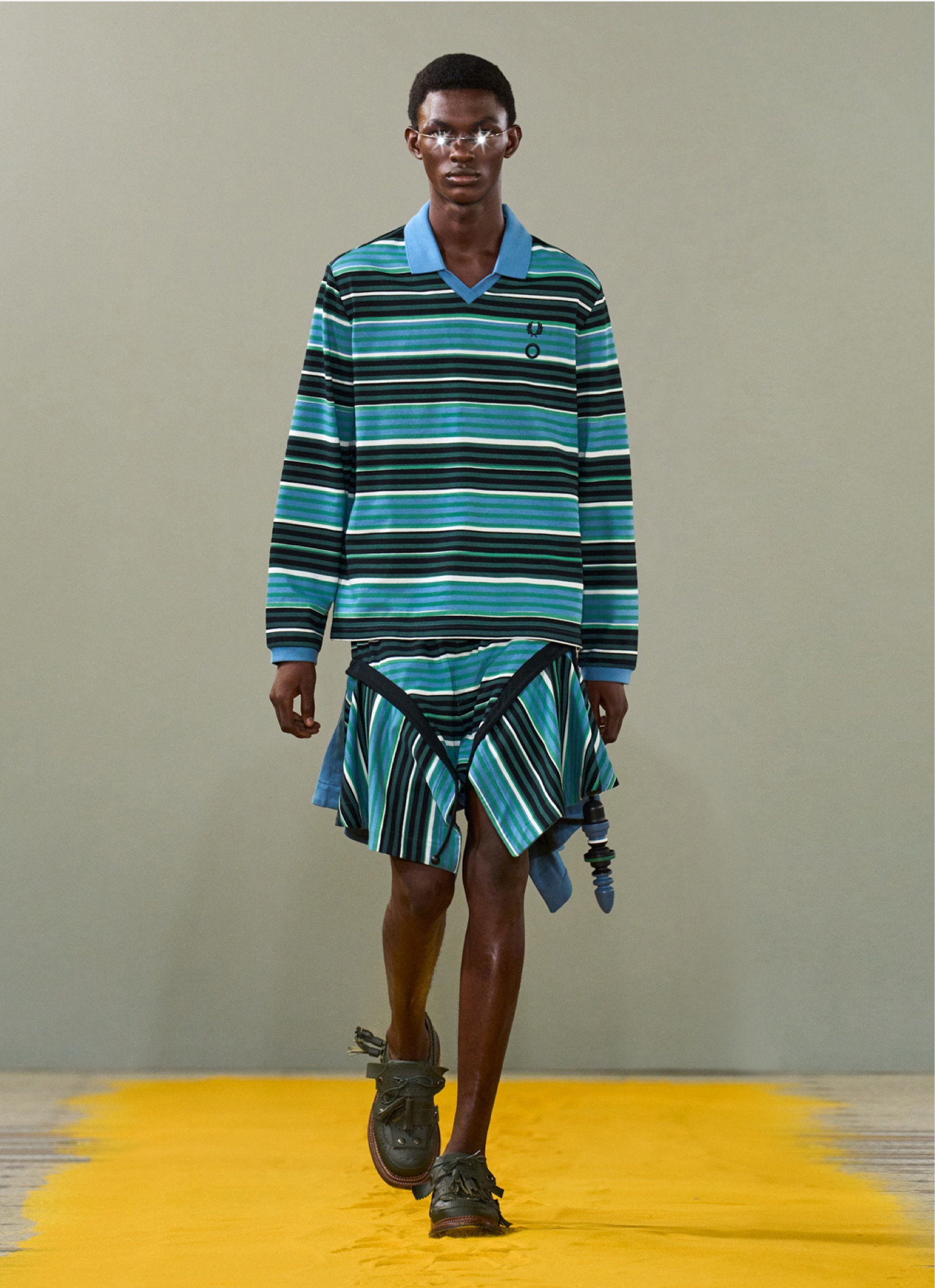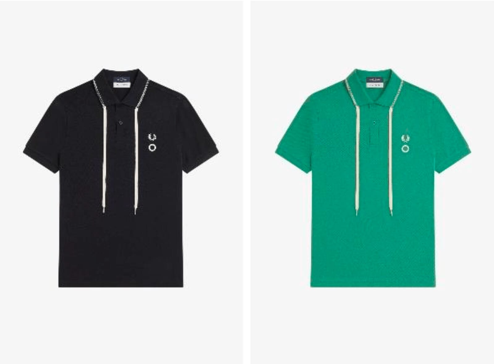 コレクションの起点となるのは、ブランドの象徴でもあるフレッドペリーシャツ。スポーツウェアとしての本質を保ちながらシルエットをアレンジしている。ブラックとグリーン2色で展開されるポロシャツには、襟元にロングドローコードを採用し、機能性と造形的なバランスを両立させた。