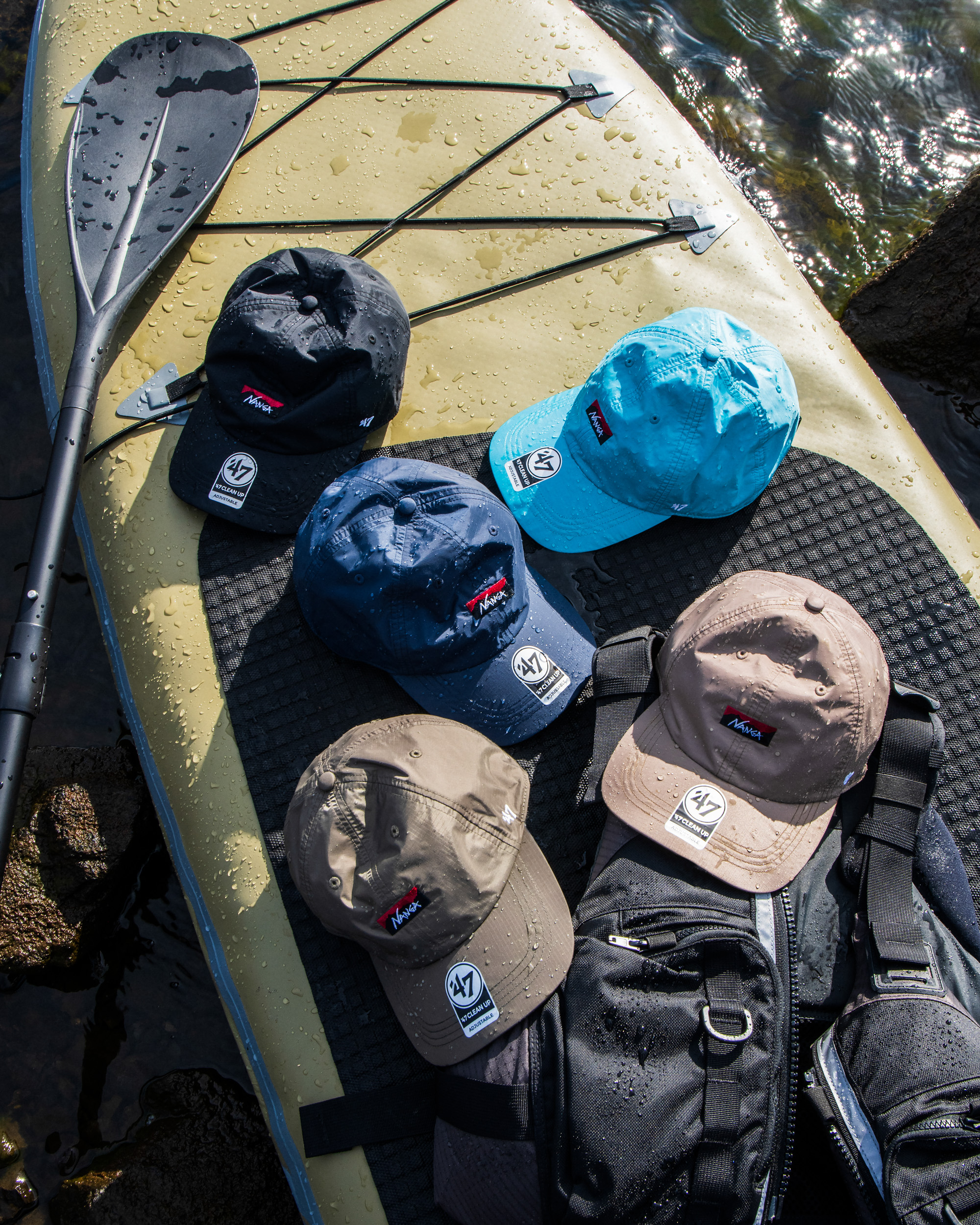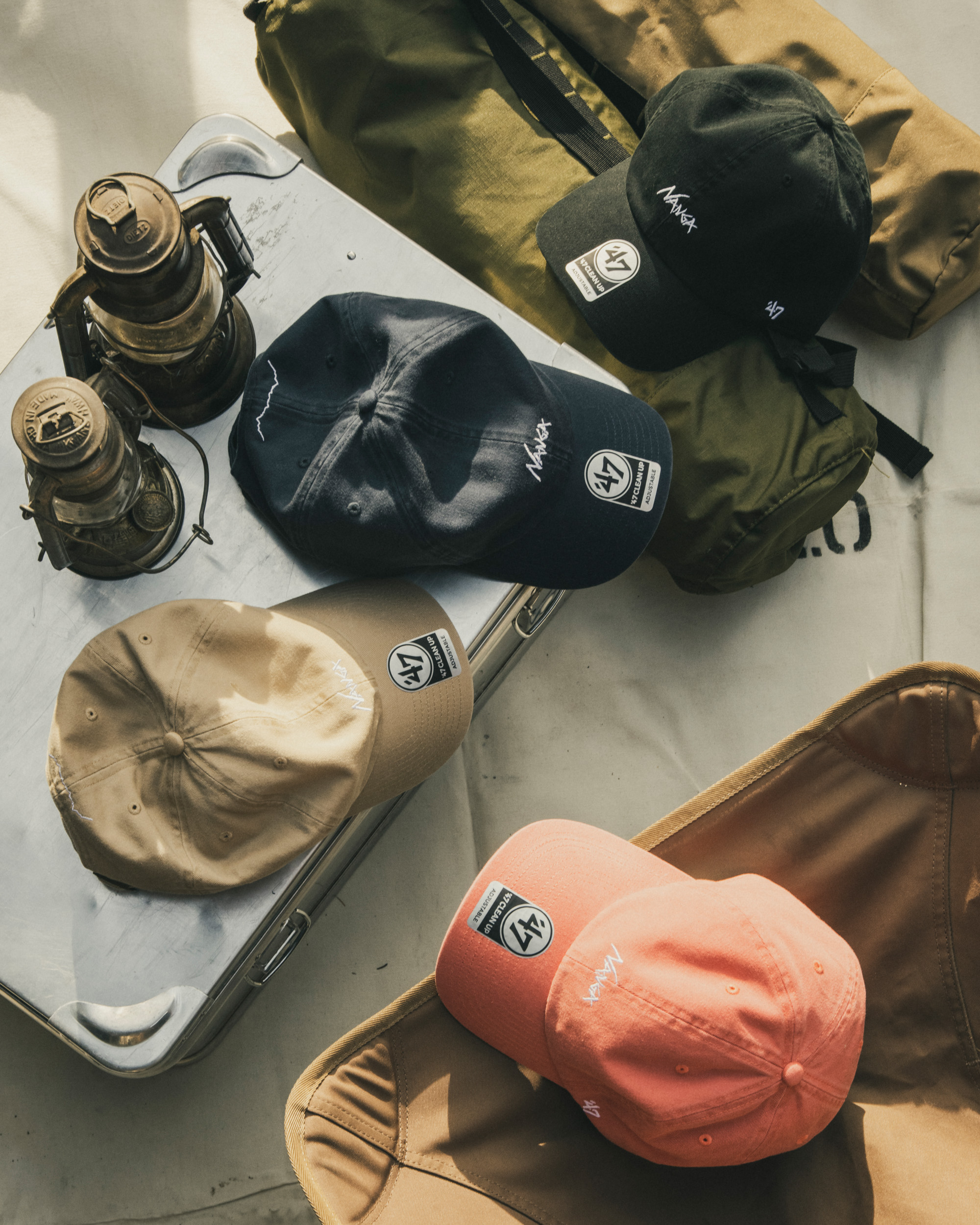 本コレクションでは、2型のカーブドバイザーキャップを展開。「’47 CLEAN UP MF」にはNANGAが独自開発した防水透湿素材「AURORA-TEX®」と難燃素材「HINOC」を採用し、「’47 CLEAN UP」には’47オリジナルのウォッシュドコットン生地を落とし込んだ。