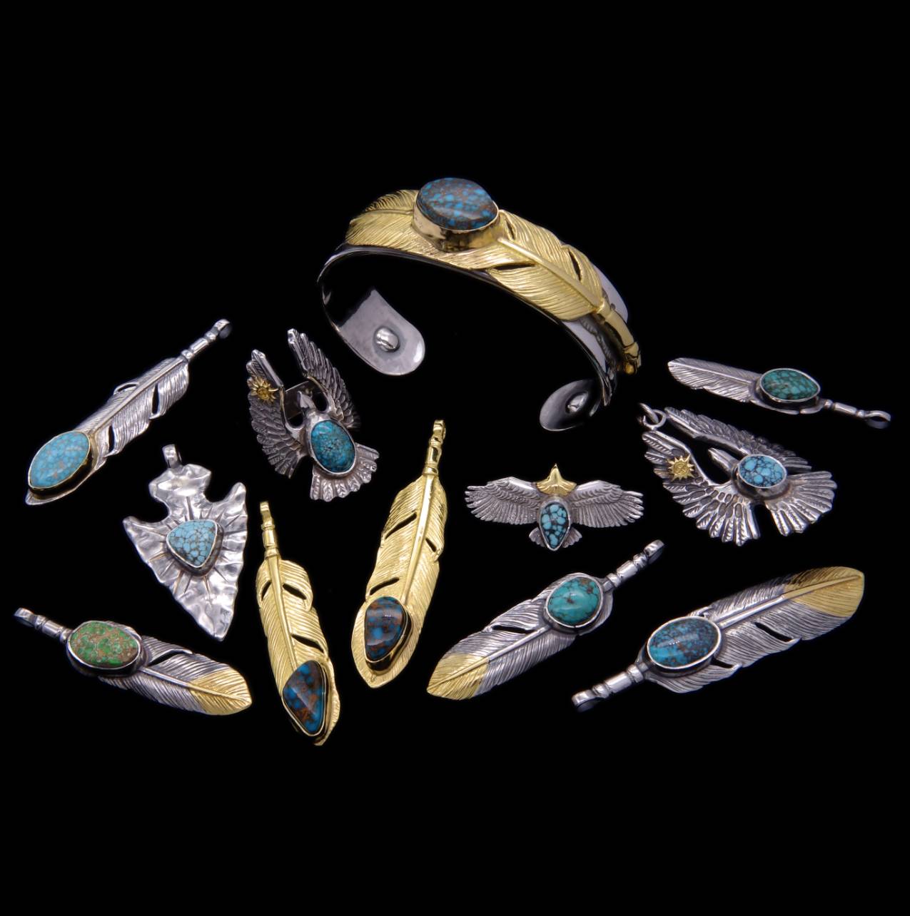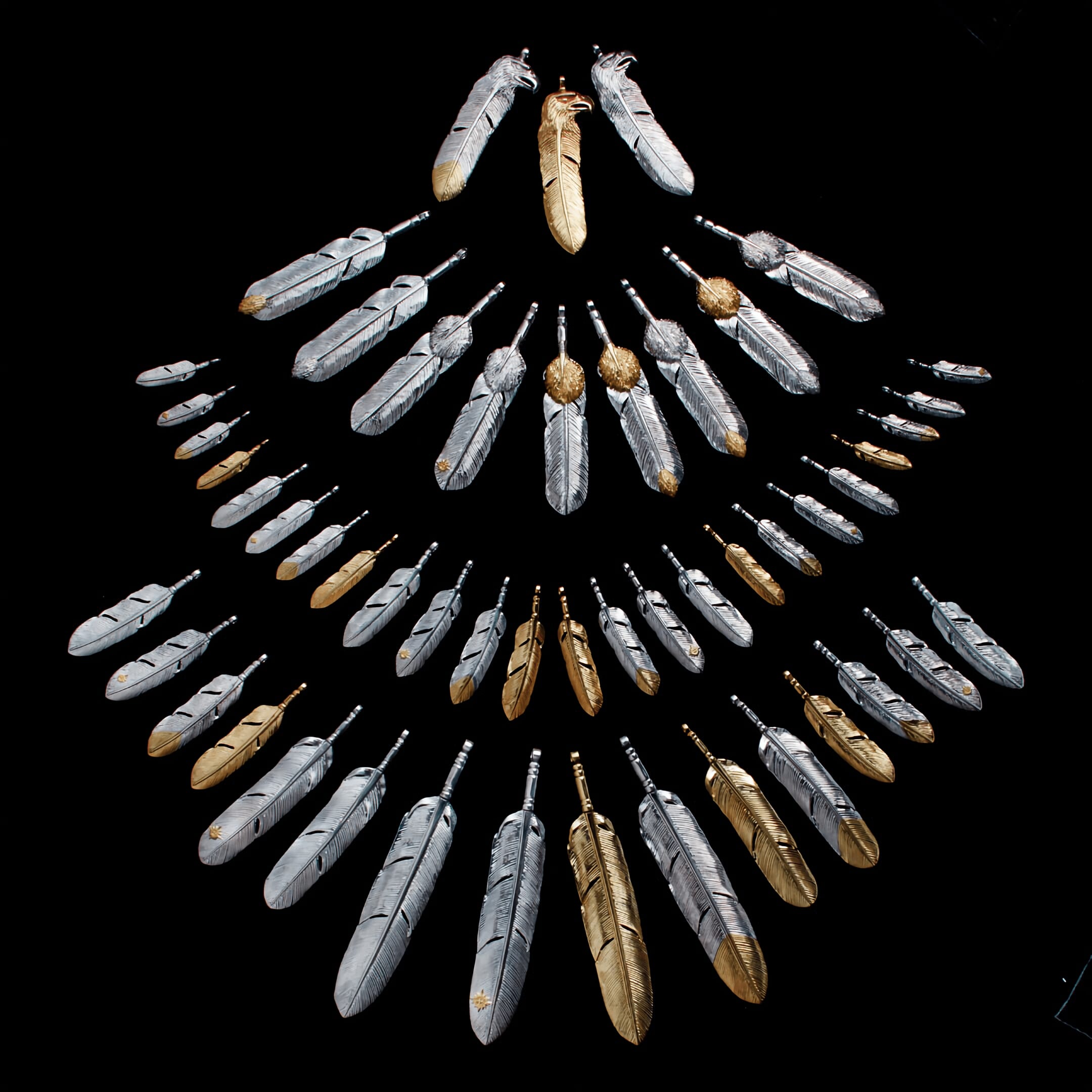 さらに「フェザー」は、ゴールデンイーグルの羽根を象った神聖なモチーフ。偉大さと強い精神力の象徴として崇められてきた存在であり、ネイティブアメリカンの伝統に則った正式なデザインで制作されている。その精緻な造形からは、受け継がれてきた歴史と精神性が感じられる。