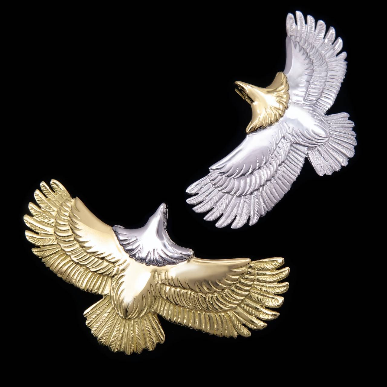 1980年代に完成された「イーグル」モチーフもまた、REDMAN.を象徴するデザインのひとつだ。イヌワシが大空を舞う姿を緻密な彫金で表現し、厚みや彫りの強弱によって細部まで忠実に再現。空高く飛翔する姿から、祈りを天へと届けるお守りとして信じられている。