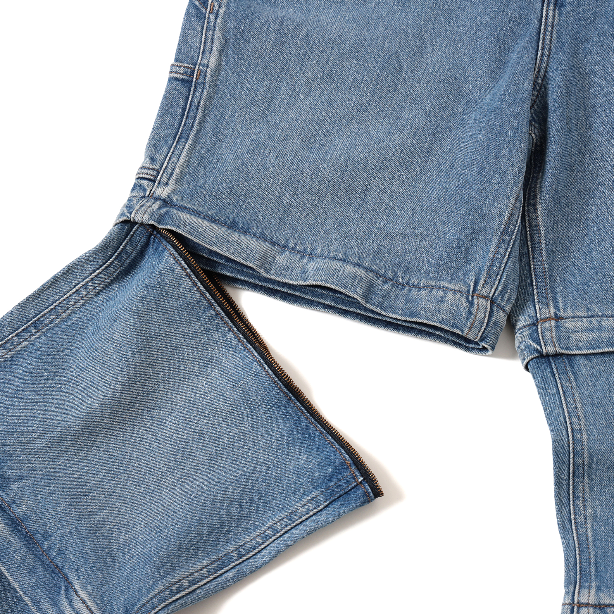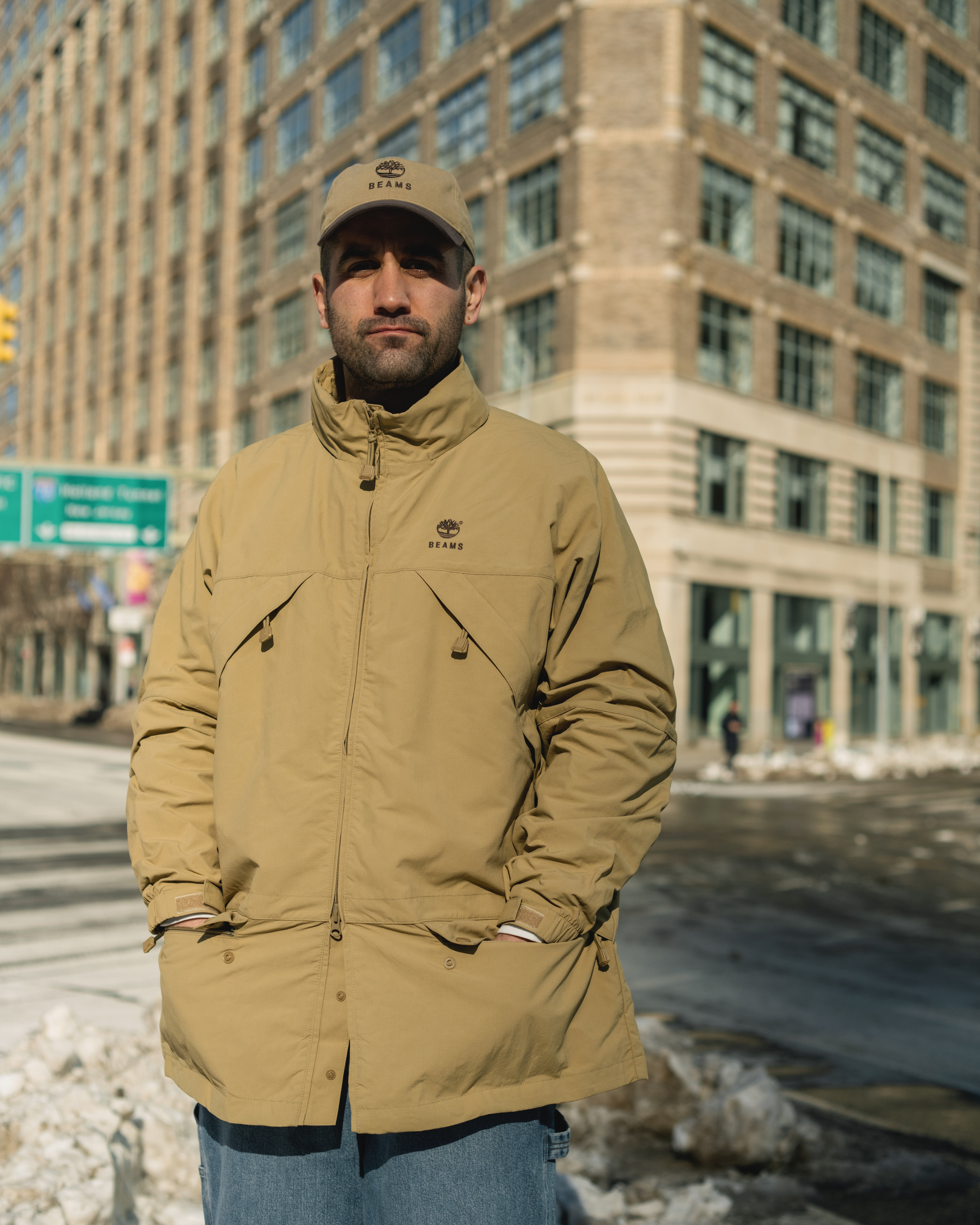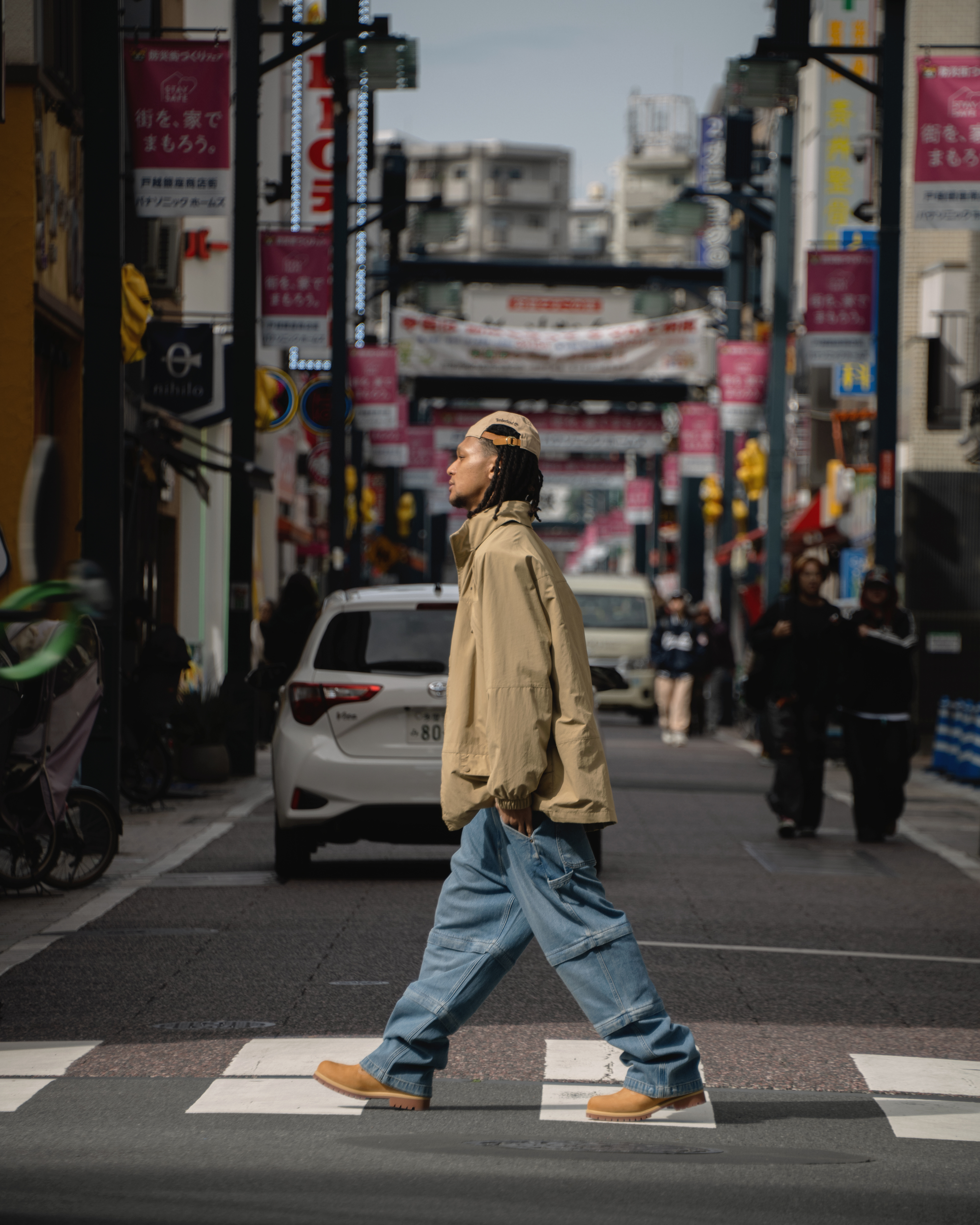 両ブランドのコラボでは初となるウエアとキャップは、Timberlandの貴重なアーカイブが起点となっている。オーセンティックなデザインが魅力のナイロンジャケットは、実はショート丈とミディアム丈の2段階のアレンジが可能。デニムパンツはデタッチャブル仕様でフルレングス、ショート、膝下ハーフと3パターンの長さで着られるギミックの効いたデザインが魅力だ。いずれもブランドらしい着こなしが楽しめると同時に、高い実用性や機能性も兼ね備えている。