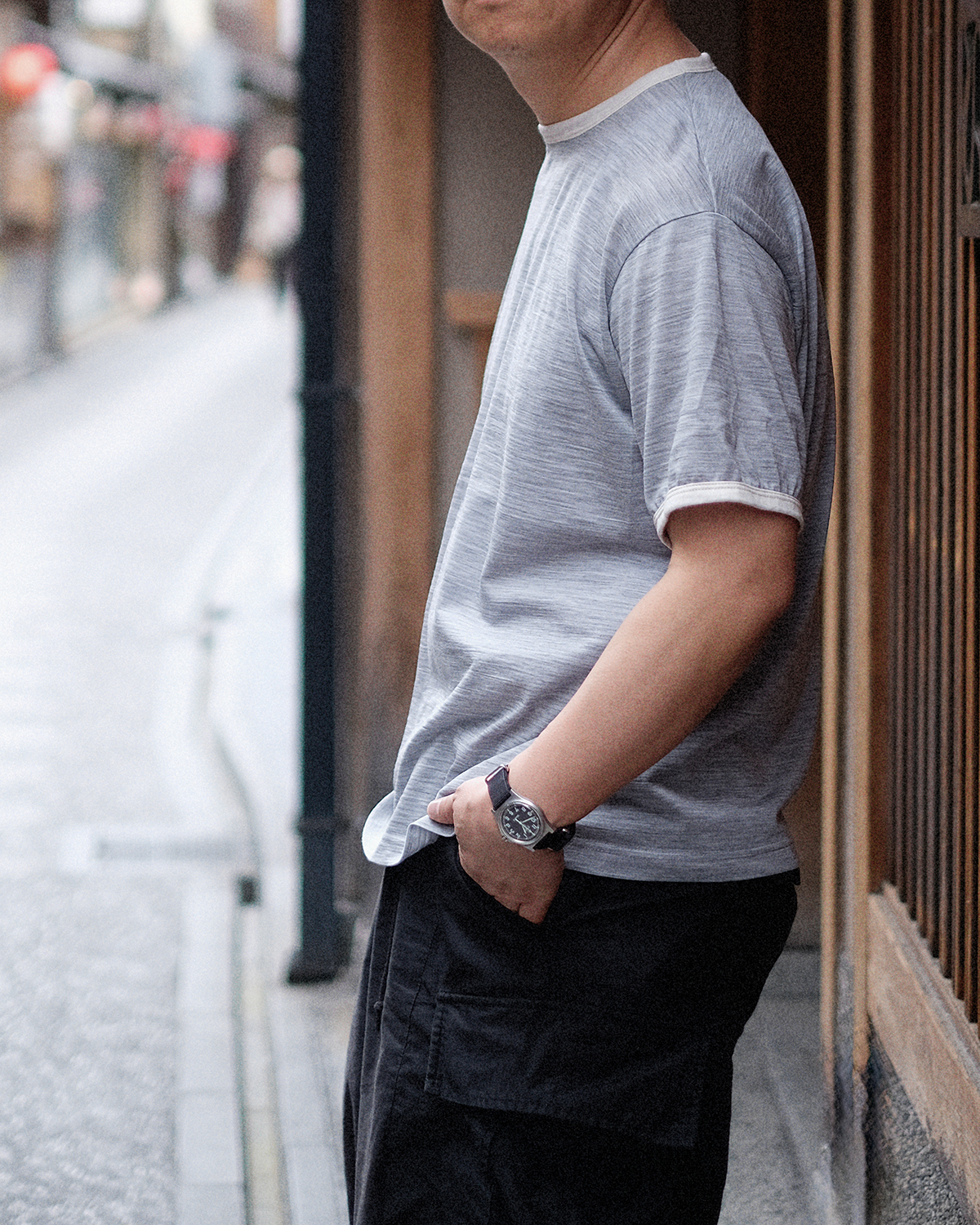 イギリスで受け継がれてきた歩く旅「Rambling(ランブリング)」をテーマにしたCaledoorと、関西屈指のセレクトショップLOFTMAN1981がコラボレーション。ベーシックで高品質なアイテムを発信する両者がタッグを組んで製作したのは、型から別注したメリノウールリンガーT シャツだ。スポーティーな印象の強いリンガーTを、上質な素材とラフになりすぎないシルエット使いで落ち着いた大人の日常着に仕上げた。