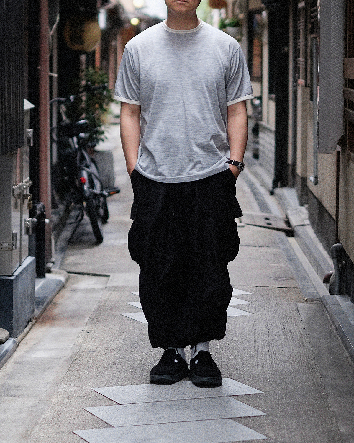 イギリス海軍のトレーニング Tシャツをデザインソースに、ネックと袖口にバインダー仕様を取り入れ、リンガーTとして再構築した。シルエットは適度にゆとりをもたせ、上品な大人のリラックス感を演出。