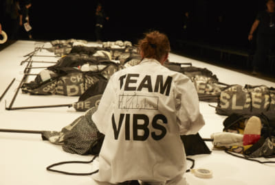 [ヘンリック・ヴィブスコフ]の2018AWテーマは「メジャーメント(計測)」。ヤン・ファーブルの作品「雲を測る男」で表現されている、見えない何かを測っている詩的なジャスチャーからインスパイア、コレクションに落とし込んだ。カモ柄のコートは、 柔らかくて軽い素材が特徴。