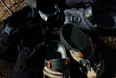 本アイテムは登山やキャンプサイトで実際に使用できるファンクショナルなギアとしてデザインされており、左足には実際に使用可能なライトや小さなポーチ、右足にはロープの束、コンパス、バンジーコード、ハンギングループが装備され、ブーツのような見た目と履き心地を実現。様々なアクティビティに対応する万能なモデルとなっている。