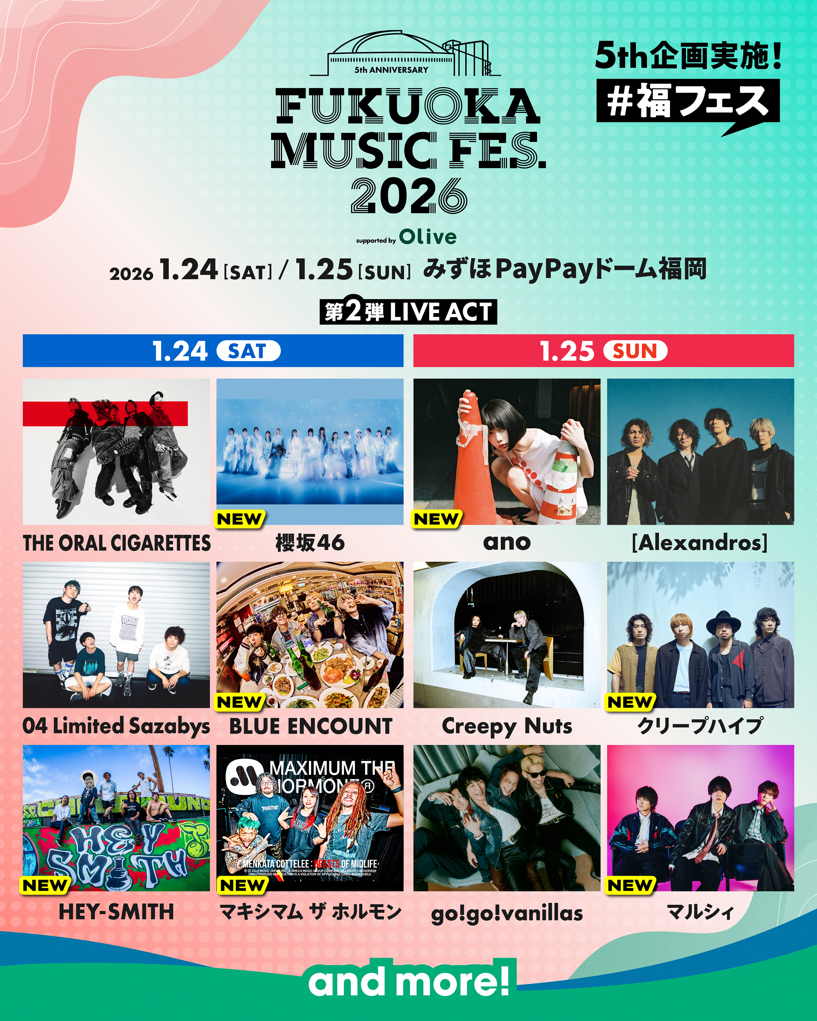 通称“福フェス”として親しまれる音楽イベント「FUKUOKA MUSIC FES」が、来年1月24日(土)・25日(日)の2日間、みずほPayPayドーム福岡にて開催される。
