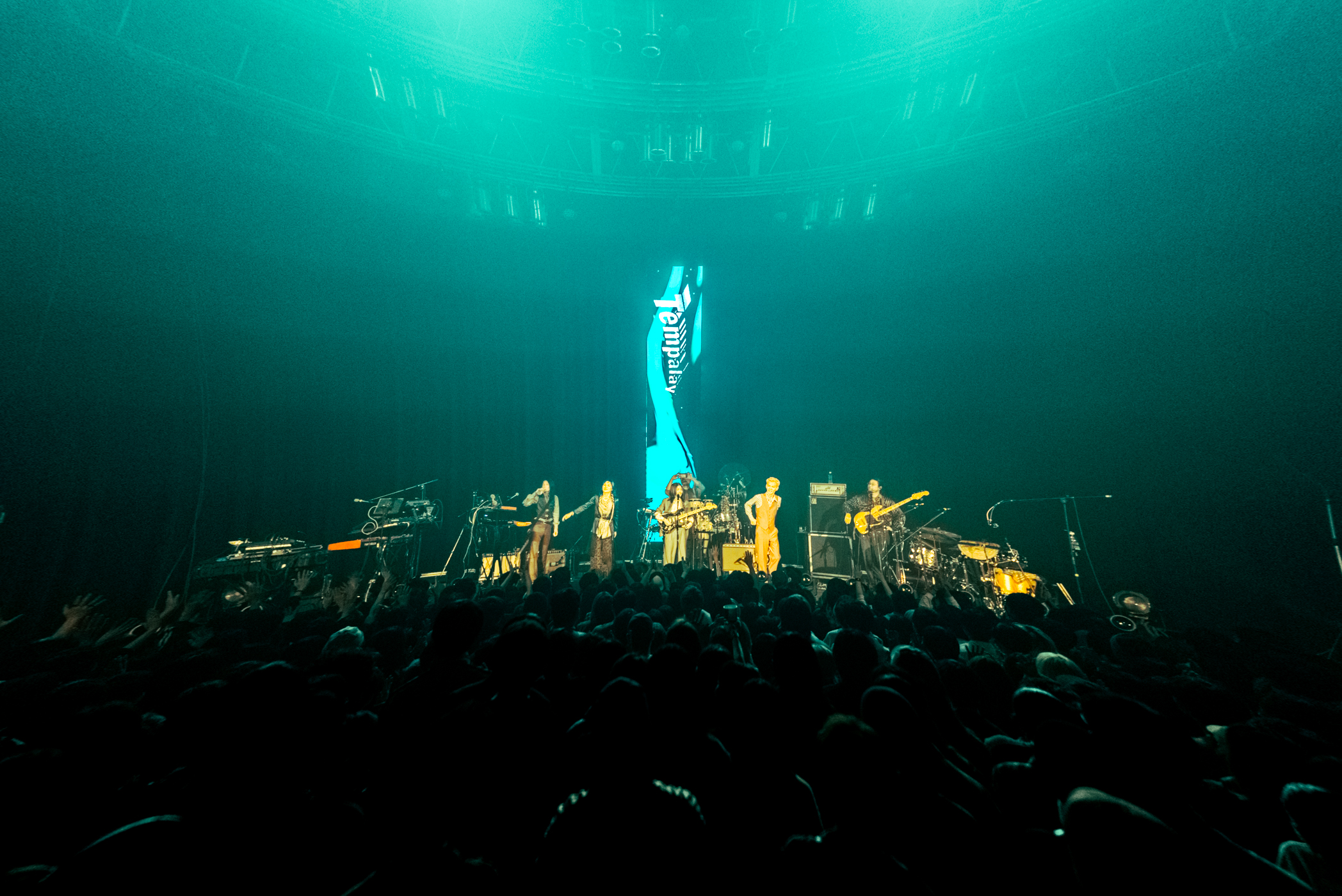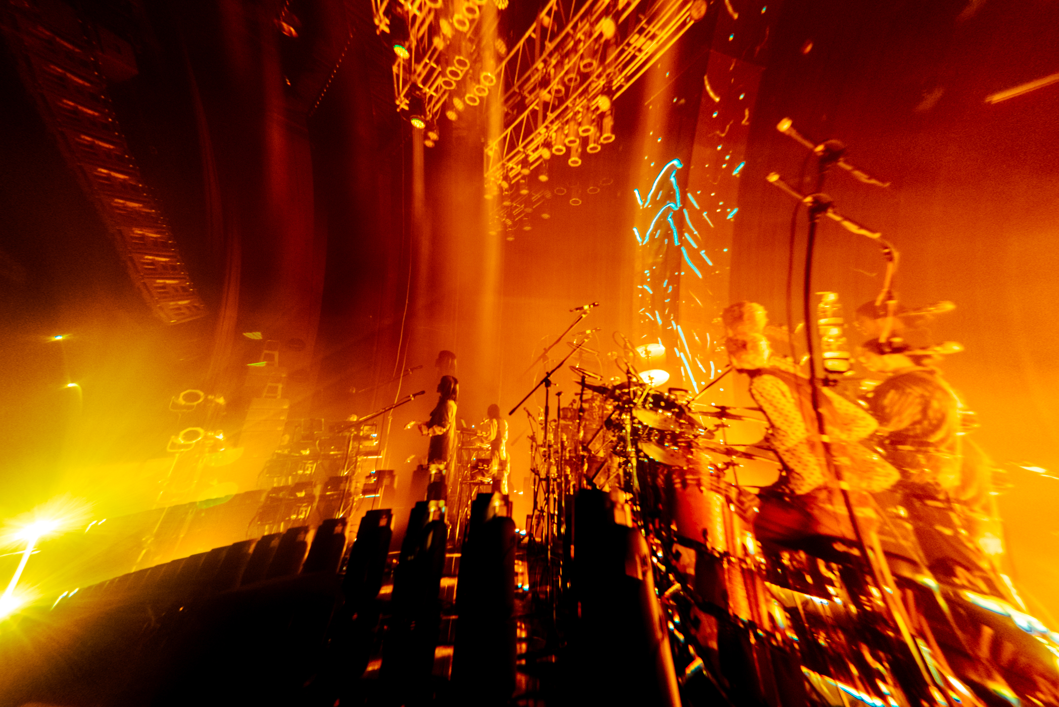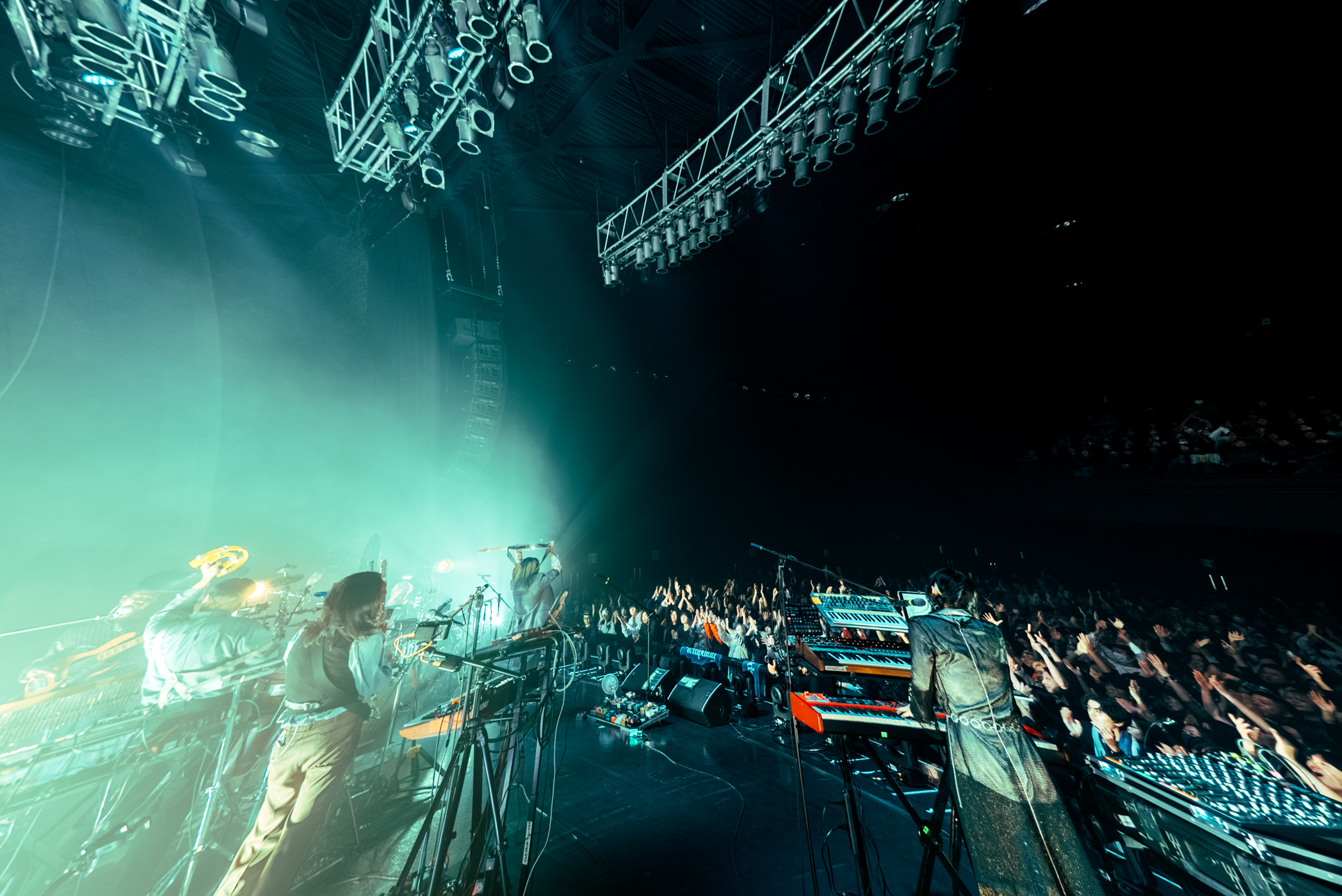 再びオープニングのような緊迫感のあるサウンドFXが鳴り響くと、そこからセッションに突入し、綾斗のギターリフで「SONIC WAVE」へ。「ナナナ」の大合唱が起きる中、ライブ中盤のさらなるハイライトになったのが「EDEN」だ。音源よりも明らかにアグレッシブな演奏によってバンド全体がトランス状態に突入し、間奏では松井がシンバルを打ち鳴らし、夏樹がそれ以上のテンションでドラムを乱れ打つと、ラストは綾斗と高田が2人してステージ前方に出て行ってのツインギターで締めくくるという、息もつかせぬ展開がまさに圧巻。続く「預言者」でのAAAMYYYの歌声とエレピが一服の清涼剤となったものの、「大東京万博」では再び「らっせーら!」の合唱で盛り上がる。ここまでをほぼほぼ一気に畳み掛け、すでに充足感はかなりのものだ。