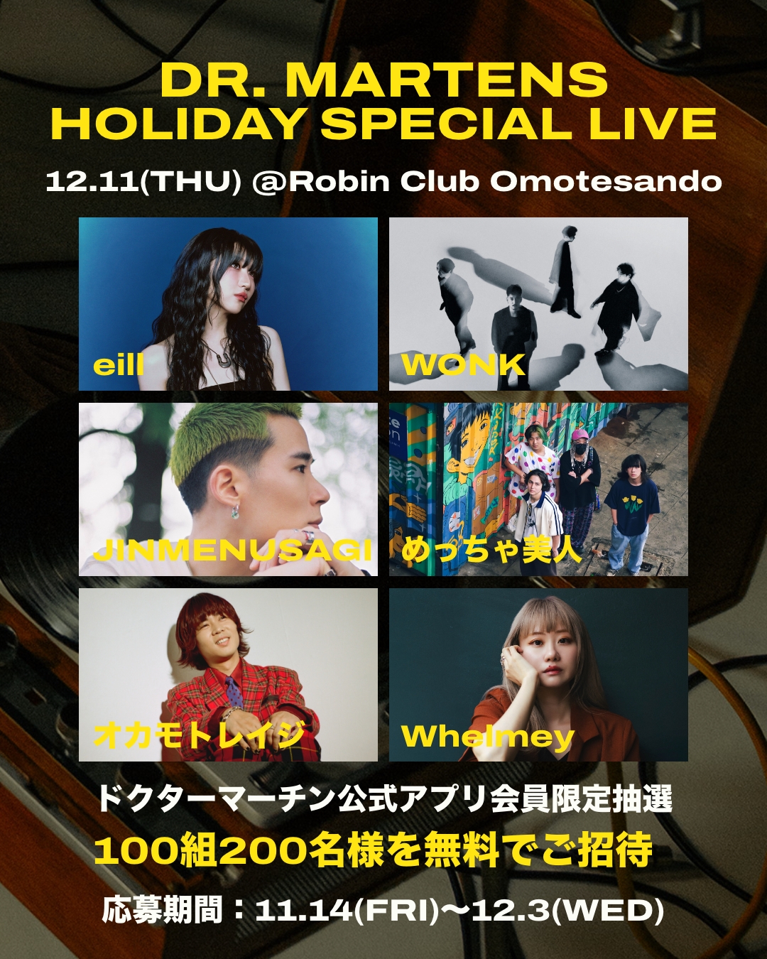 Dr. Martensが特別音楽イベント「Dr. Martens HOLIDAY SPECIAL LIVE」を、12月11日(木)に表参道・Robin Clubで開催する。音楽をはじめとするサブカルチャーと深く結びつきのあるDr. Martensらしく、ジャンルを越えて活躍するアーティストが集結。音楽シーンを牽引するアーティストからネクストブレイクまで、多彩なラインナップとなっている。