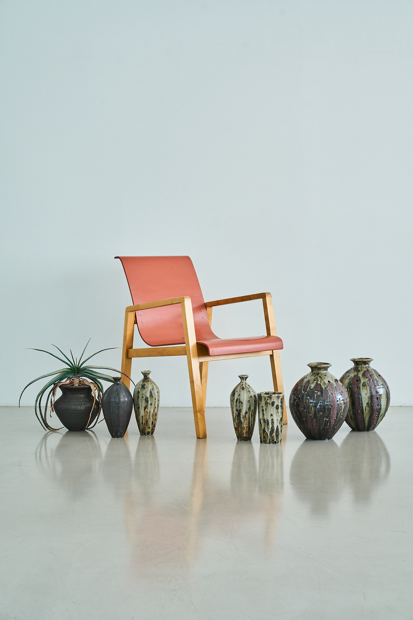 これらの作品と呼応するように、アルヴァ・アアルトによる1940〜60年代のヴィンテージファニチャーも配置。アームチェアやスツール、テーブルなど、現在では希少な⼀点物のピースが揃う。有機的なフォルムと⼈間的なスケールを備えたアアルトの家具と⼩野の作品が持つ素材の質感が重なり合い、時代や地域を超えた造形の魅力を体感できる展示となっている。その関係性を、ぜひ会場で感じてみてほしい。